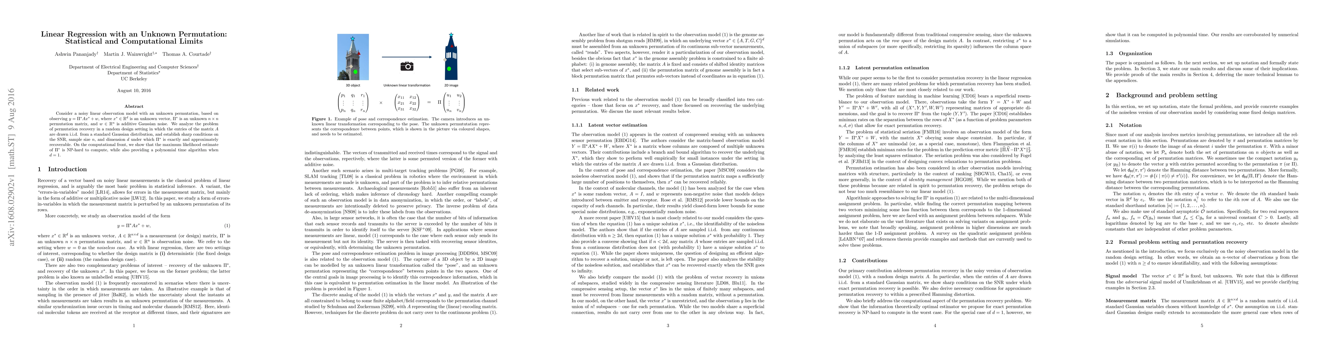 Consider a noisy linear observation model with an unknown permutation, based on observing $y = \Pi^* A x^* + w$, where $x^* \in \mathbb{R}^d$ is an unknown vector, $\Pi^*$ is an unknown $n \times n$ permutation matrix, and $w \in \mathbb{R}^n$ is additive Gaussian noise. We analyze the problem of permutation recovery in a random design setting in which the entries of the matrix $A$ are drawn i.i.d. from a standard Gaussian distribution, and establish sharp conditions on the SNR, sample size $n$, and dimension $d$ under which $\Pi^*$ is exactly and approximately recoverable. On the computational front, we show that the maximum likelihood estimate of $\Pi^*$ is NP-hard to compute, while also providing a polynomial time algorithm when $d =1$.