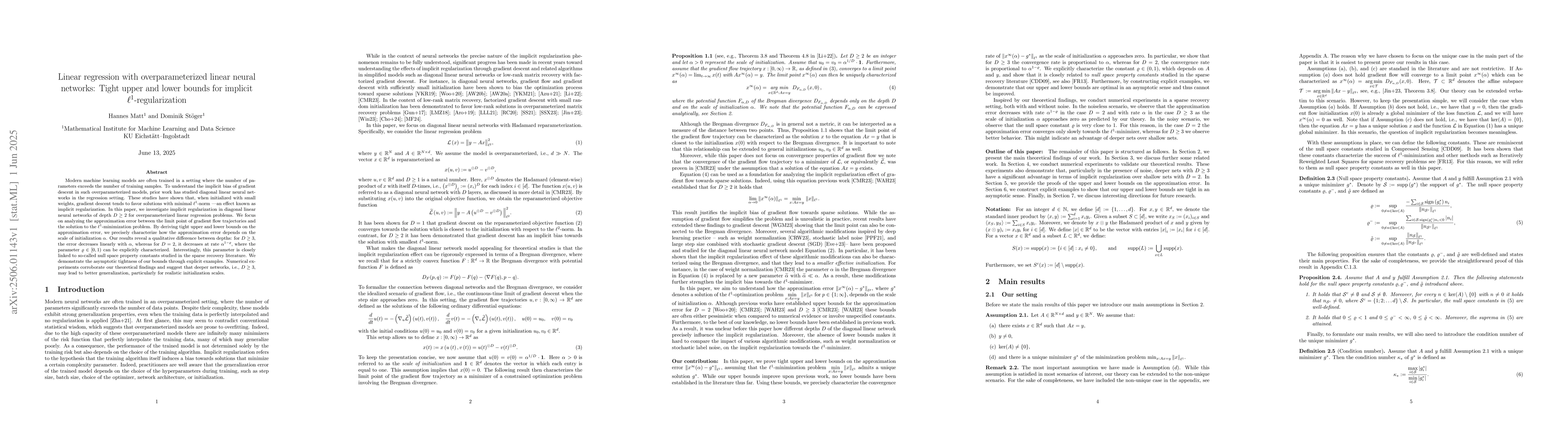 Precise characterization of approximation error in overparameterized diagonal linear neural networks, revealing depth-dependent behavior and connection to sparse recovery constants.