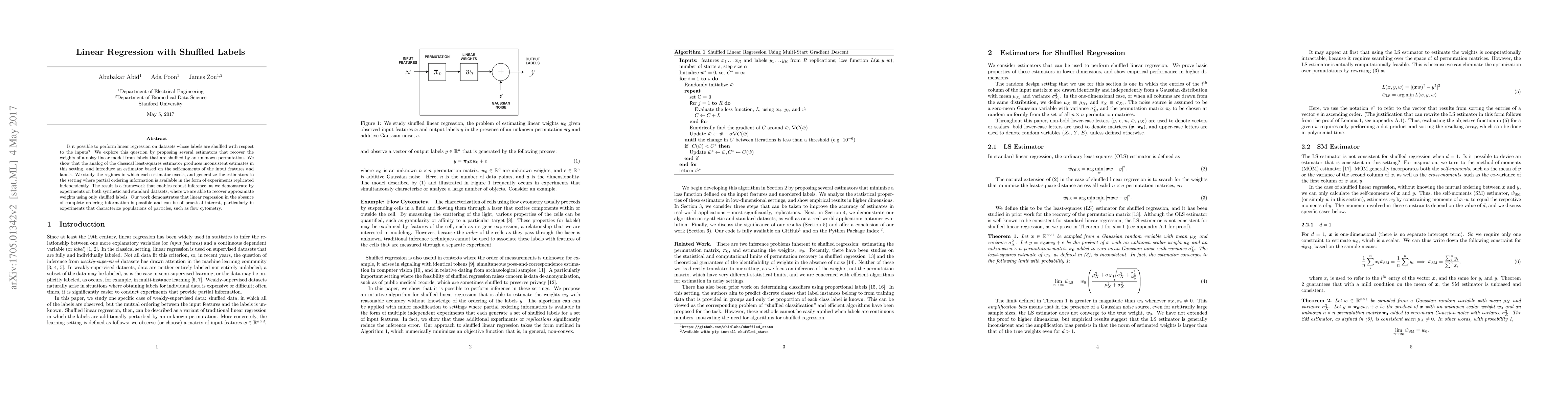 Is it possible to perform linear regression on datasets whose labels are shuffled with respect to the inputs? We explore this question by proposing several estimators that recover the weights of a noisy linear model from labels that are shuffled by an unknown permutation. We show that the analog of the classical least-squares estimator produces inconsistent estimates in this setting, and introduce an estimator based on the self-moments of the input features and labels. We study the regimes in which each estimator excels, and generalize the estimators to the setting where partial ordering information is available in the form of experiments replicated independently. The result is a framework that enables robust inference, as we demonstrate by experiments on both synthetic and standard datasets, where we are able to recover approximate weights using only shuffled labels. Our work demonstrates that linear regression in the absence of complete ordering information is possible and can be of practical interest, particularly in experiments that characterize populations of particles, such as flow cytometry.
