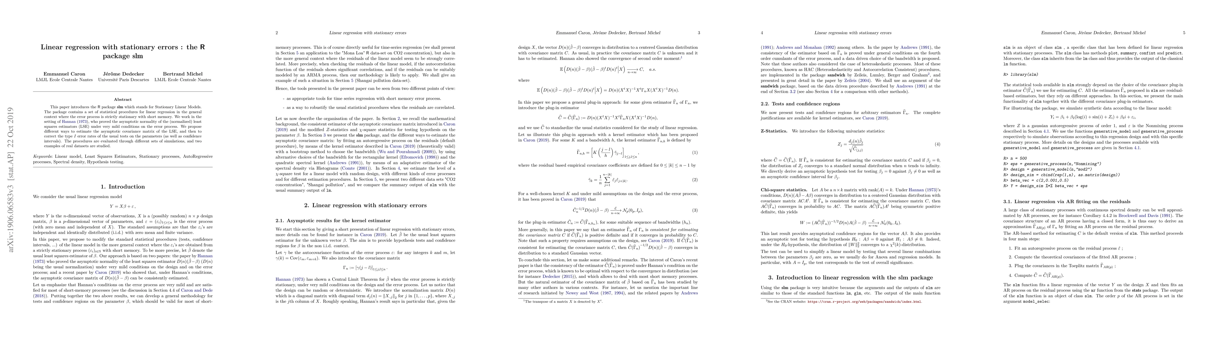 This paper introduces the R package slm for stationary linear models, providing statistical procedures for linear regression with stationary errors. It evaluates the asymptotic normality of least squares estimators and proposes methods to estimate their covariance matrix, correcting type I error rates, with simulations and real dataset examples.