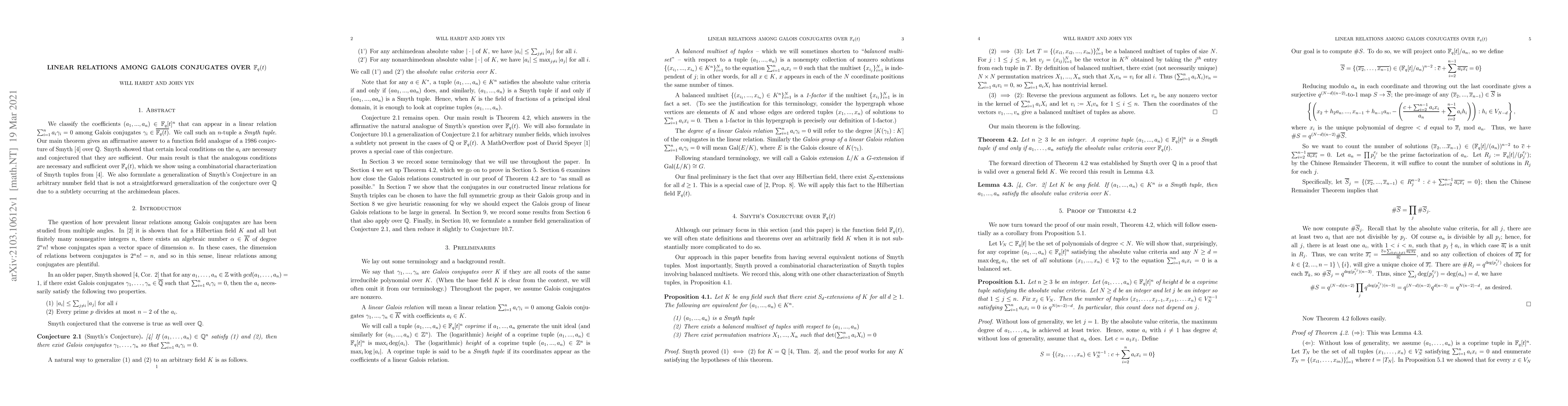 This paper classifies coefficients that form linear relations among Galois conjugates over $\mathbb{F}_q(t)$, termed Smyth tuples, proving their necessity and sufficiency. It generalizes a 1986 conjecture of Smyth from $\mathbb{Q}$ to $\mathbb{F}_q(t)$ and addresses subtleties in extending the conjecture to number fields.