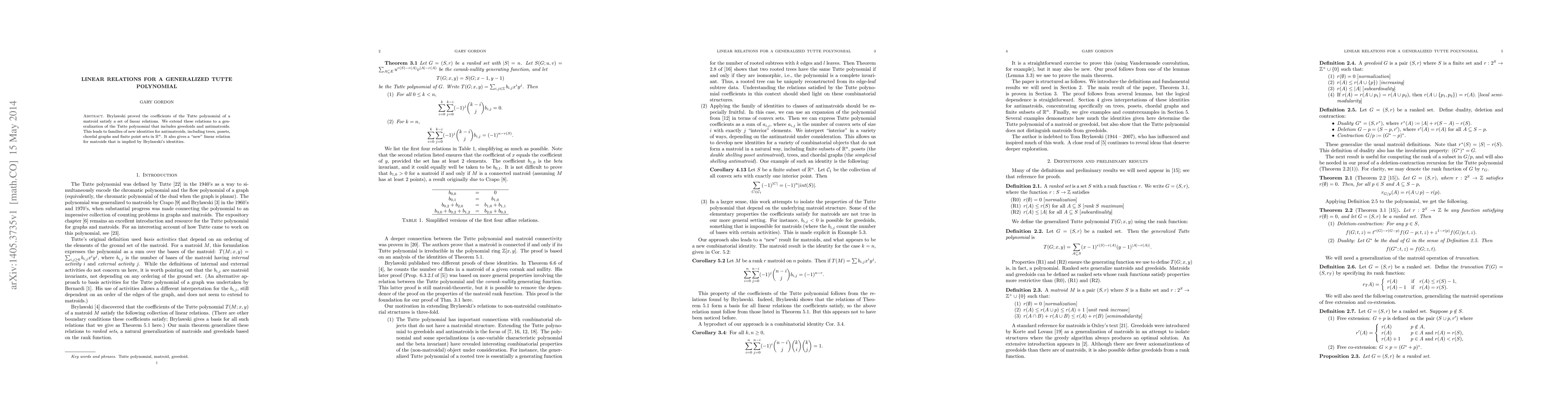 The paper extends linear relations initially proven for the Tutte polynomial of matroids to a generalized version that encompasses greedoids and antimatroids, leading to new identities for structures like trees, posets, chordal graphs, and finite point sets in $\mathbb{R}^n$. Additionally, it uncovers a new linear relation for matroids implied by Brylawski's identities.