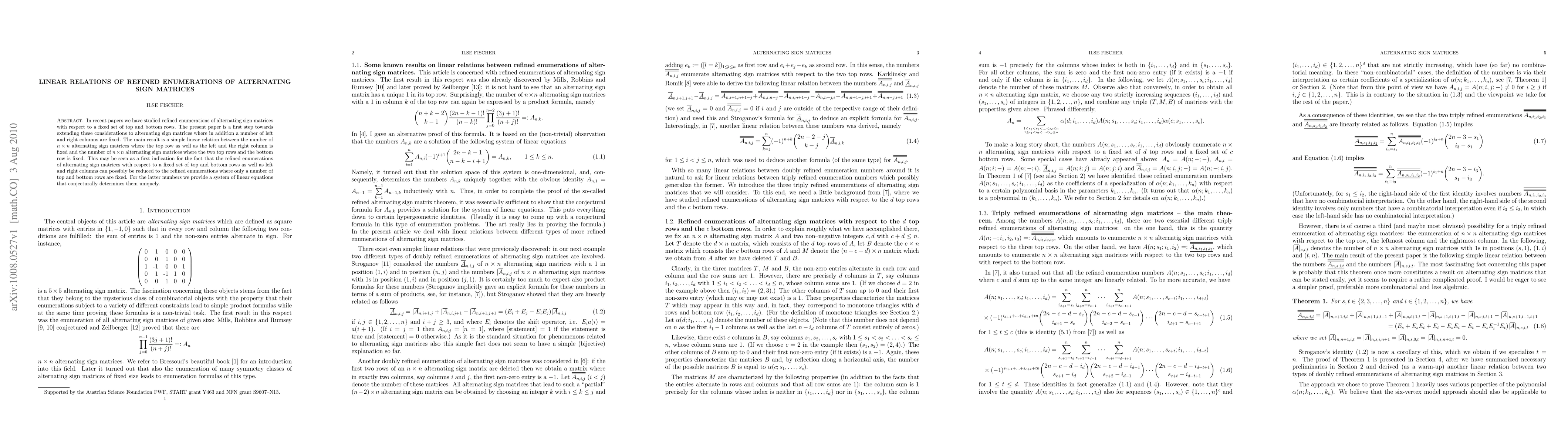 This paper establishes a linear relation between the refined counts of alternating sign matrices with fixed top and bottom rows and additional fixed left and right columns, suggesting a potential reduction in complexity in their enumeration. The authors propose a system of linear equations for the refined counts based on fixed rows, hinting at a unique determination of these numbers.