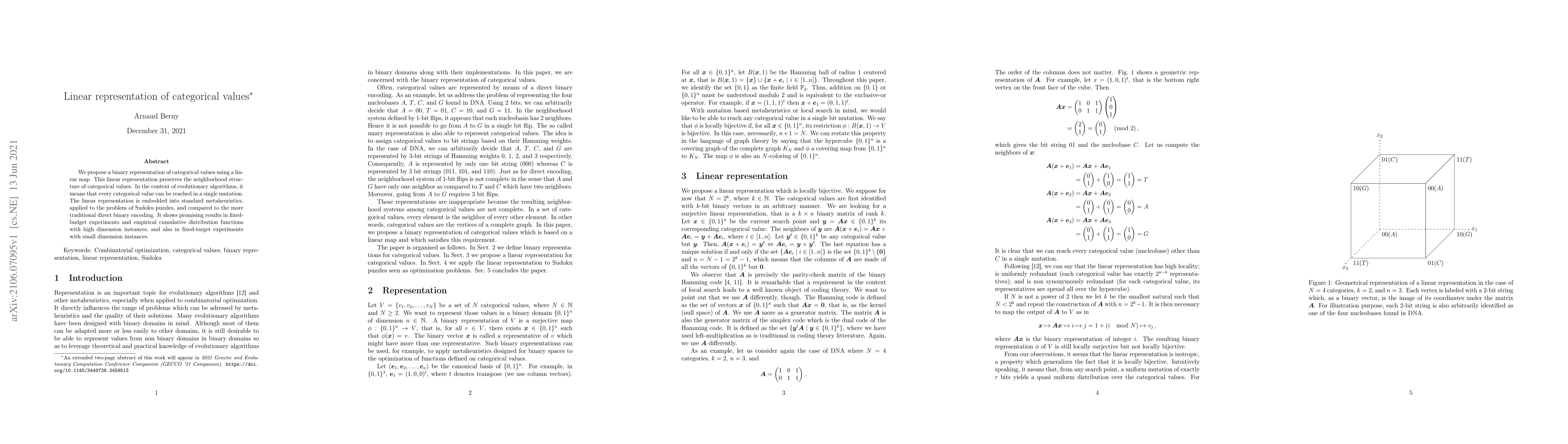 We propose a binary representation of categorical values using a linear map. This linear representation preserves the neighborhood structure of categorical values. In the context of evolutionary algorithms, it means that every categorical value can be reached in a single mutation. The linear representation is embedded into standard metaheuristics, applied to the problem of Sudoku puzzles, and compared to the more traditional direct binary encoding. It shows promising results in fixed-budget experiments and empirical cumulative distribution functions with high dimension instances, and also in fixed-target experiments with small dimension instances.