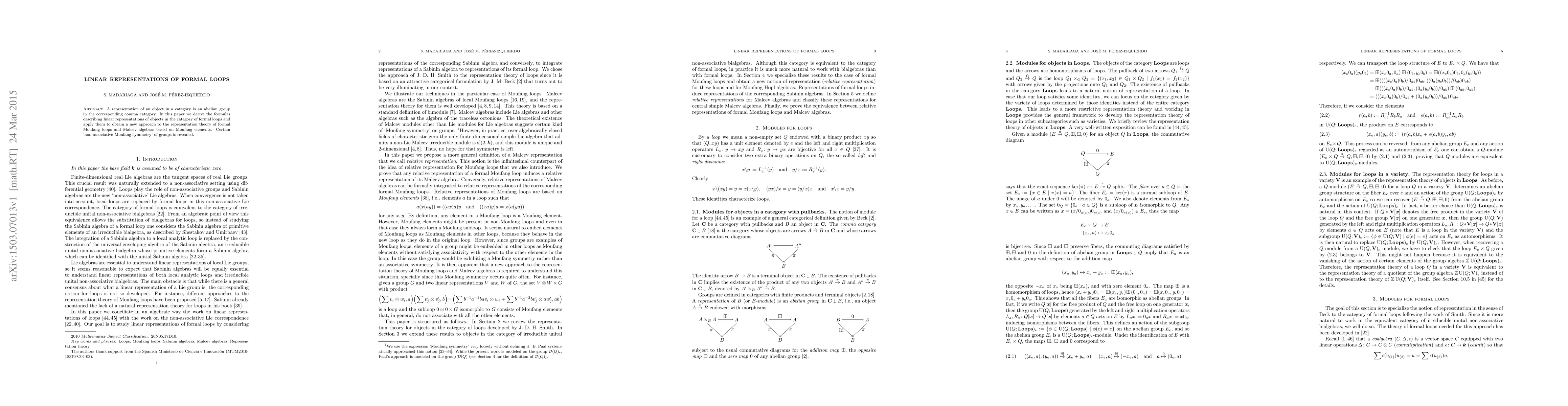 This paper develops formulas for linear representations in the category of formal loops and applies them to advance representation theory for formal Moufang loops and Malcev algebras, highlighting a novel 'non-associative Moufang symmetry' in groups.