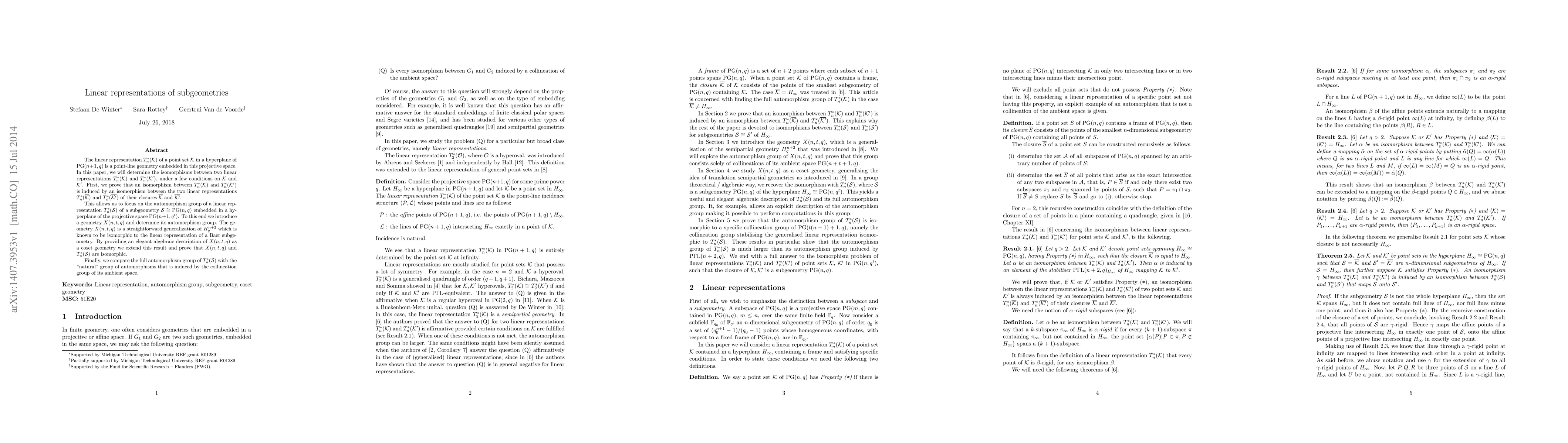 This paper determines conditions for isomorphisms between linear representations of point sets in projective spaces, focusing on subgeometries. It introduces a geometry X(n,t,q) and proves its automorphism group, showing it's isomorphic to the linear representation of a certain subgeometry. The research also compares the full automorphism group of these representations with the group induced by the ambient space's collineation group.