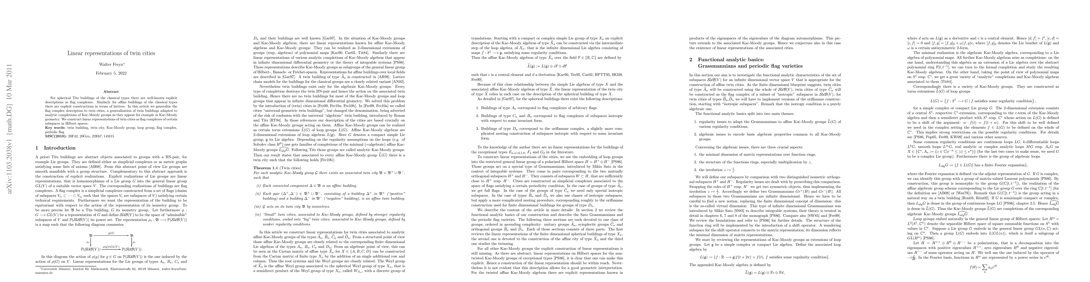 For spherical Tits buildings of the classical types there are well-known explicit descriptions as flag complexes. Similarly for affine buildings of the classical types there are explicit constructions in terms of lattices. In this article we generalize the flag complex description to twin cities, a generalization of twin buildings adapted to analytic completions of Kac-Moody groups as they appear for example in Kac-Moody geometry. We construct linear representations of twin cities as flag complexes of certain subspaces in Hilbert spaces.