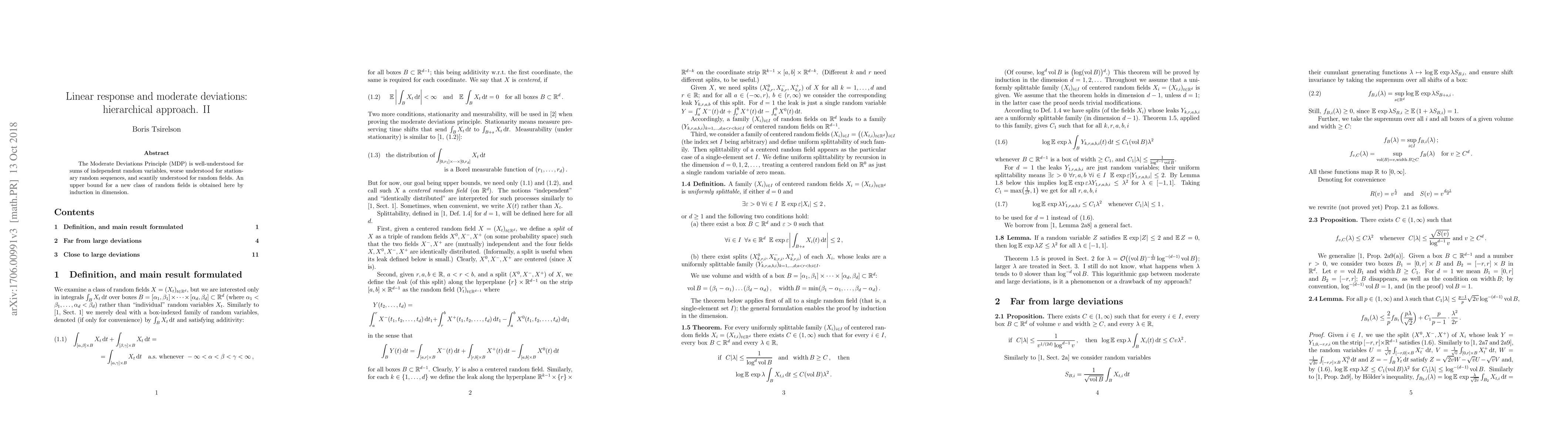 The Moderate Deviations Principle (MDP) is well-understood for sums of independent random variables, worse understood for stationary random sequences, and scantily understood for random fields. An upper bound for a new class of random fields is obtained here by induction in dimension. Version 3. Sect 1. Stationarity, being not essential in the proofs, is removed from the definitions and the main result formulation. Sect. 2. $[C,2C]$ instead of $[C_1,2C_1]$ before Prop. 2.6; $ a\ge1$ instead of $a\ge C/C_1$ in the last proof; Remark 2.5 added; supremum over shifts in (2.2) (formerly (2.3)); "centered" instead of "CMS". Cosmetic changes: indexing of leaks; Remark 2.11. Sect. 3. Cosmetic change: semicolon after the second display of the proof of Lemma 3.9. References: "response", not "responce".