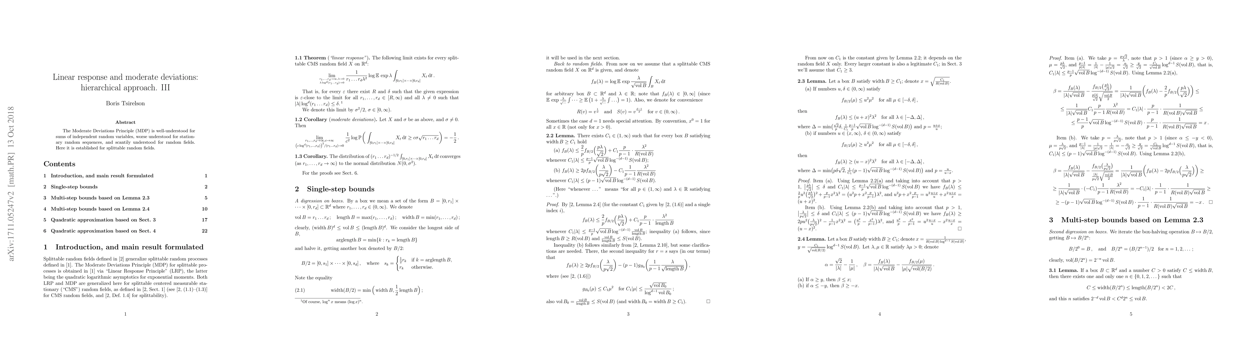 The Moderate Deviations Principle (MDP) is well-understood for sums of independent random variables, worse understood for stationary random sequences, and scantily understood for random fields. Here it is established for splittable random fields. Version 2. Adapted to new Version 3 of [2] arXiv:1706.00991. Terminology: "CMS random fields". Numbers of items in [2] updated. References: "response", not "responce". Otherwise unchanged.