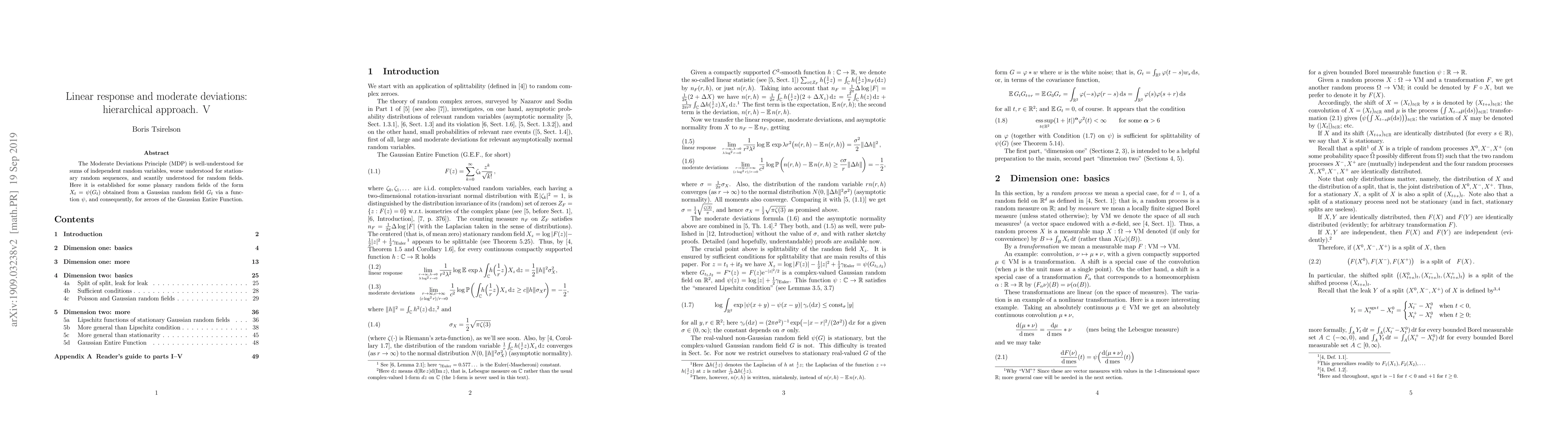 The Moderate Deviations Principle (MDP) is well-understood for sums of independent random variables, worse understood for stationary random sequences, and scantily understood for random fields. Here it is established for some planary random fields of the form $ X_t = \psi(G_t) $ obtained from a Gaussian random field $ G_t $ via a function $ \psi $, and consequently, for zeroes of the Gaussian Entire Function. Version 2: Appendix "Reader's guide to parts I-V" added. Minor changes, as follows. Formulations corrected: (2.1), 3.12(b), 4.5. Proofs corrected: 2.5, 2.6, 3.12, 3.16, 3.19, 4.13, 4.14, 4.15, 5.14. Formulations clarified: 2.10, 2.11 (former 2.9, 2.10), 3.17, 5.14, 5.15, 5.23. Clarifications/copyedit: remarks 2.11 (former 2.10), 5.17; pages 5, 11, 15, 21, 22, 36, 39, 40, 41, 42; refs [5], [6].