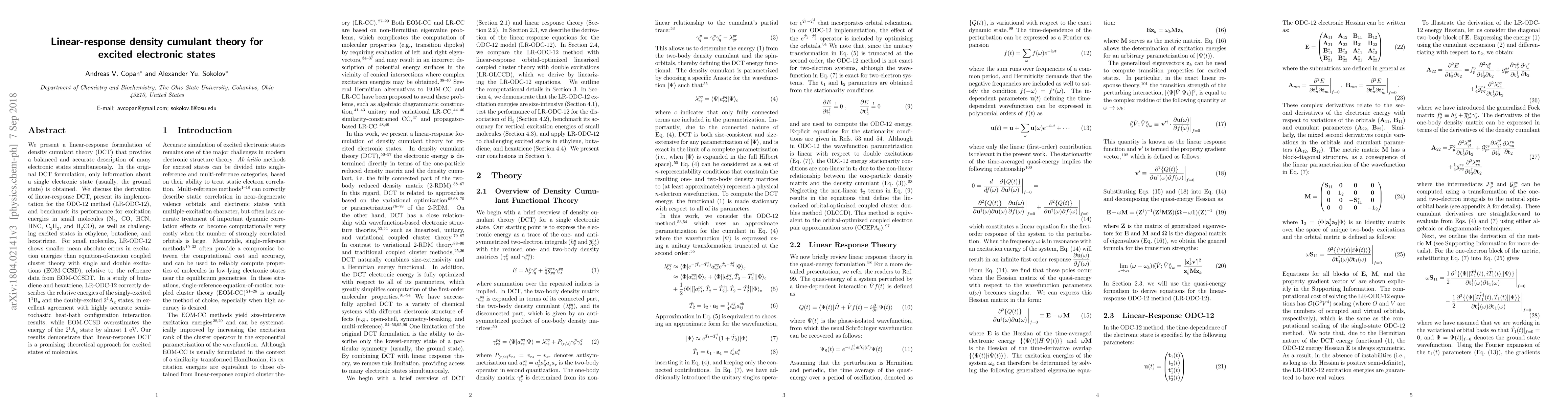 This paper introduces a linear-response formulation of density cumulant theory (DCT) that accurately describes multiple electronic states. The proposed method, LR-ODC-12, shows improved accuracy in predicting excitation energies compared to EOM-CCSD, especially in complex molecules like butadiene and hexatriene.
