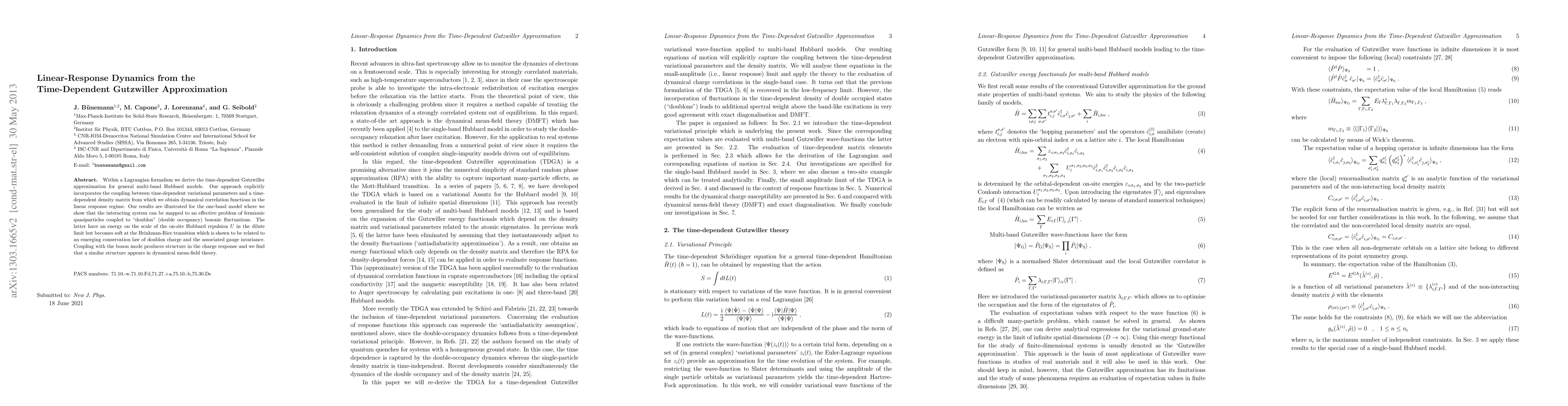 Within a Lagrangian formalism we derive the time-dependent Gutzwiller approximation for general multi-band Hubbard models. Our approach explicitly incorporates the coupling between time-dependent variational parameters and a time-dependent density matrix from which we obtain dynamical correlation functions in the linear response regime. Our results are illustrated for the one-band model where we show that the interacting system can be mapped to an effective problem of fermionic quasiparticles coupled to "doublon" (double occupancy) bosonic fluctuations. The latter have an energy on the scale of the on-site Hubbard repulsion $U$ in the dilute limit but becomes soft at the Brinkman-Rice transition which is shown to be related to an emerging conservation law of doublon charge and the associated gauge invariance. Coupling with the boson mode produces structure in the charge response and we find that a similar structure appears in dynamical mean-field theory.