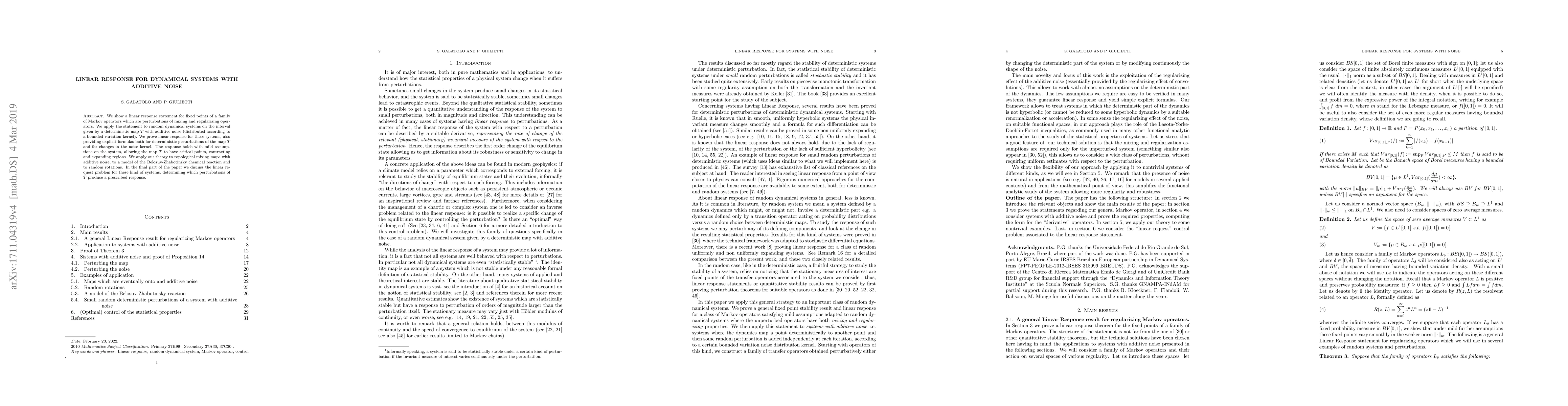 This paper establishes a linear response theorem for dynamical systems with additive noise, proving it for random dynamical systems on an interval driven by a deterministic map $T$ with noise. The authors provide explicit formulas for both deterministic perturbations and changes in the noise kernel, and discuss the linear response problem for various systems including topological mixing maps and the Belousov-Zhabotinsky reaction.
