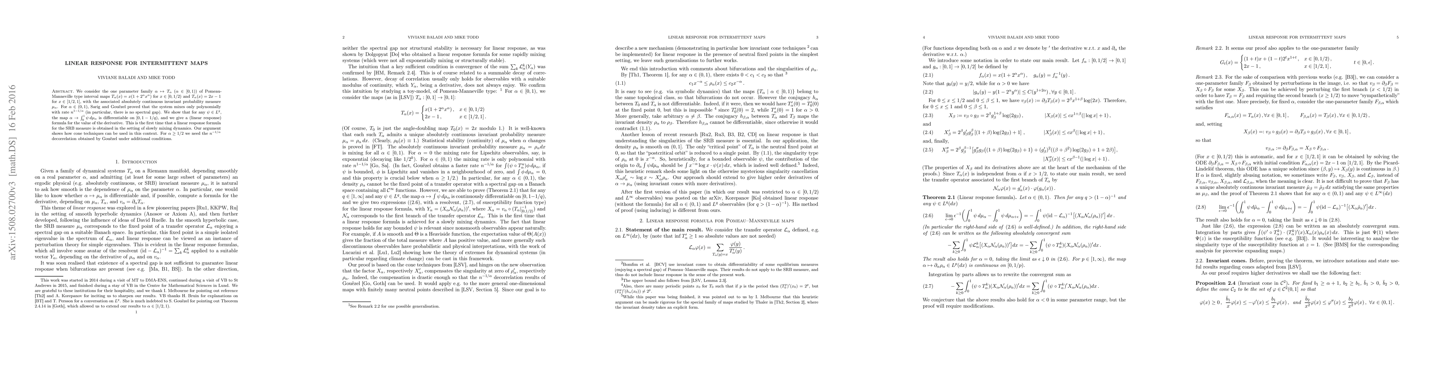 This paper investigates the linear response for a family of Pomeau-Manneville type intermittent maps, proving differentiability of the map parameterizing the SRB measure and providing a linear response formula for the derivative. This marks the first such result for slowly mixing dynamics, utilizing cone techniques and decorrelation conditions for $\alpha \ge 1/2$.