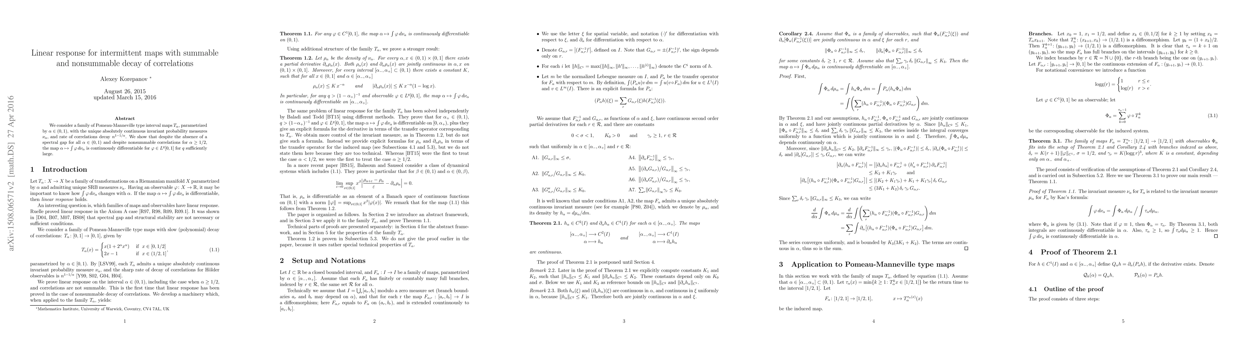 We consider a family of Pomeau-Manneville type interval maps $T_\alpha$, parametrized by $\alpha \in (0,1)$, with the unique absolutely continuous invariant probability measures $\nu_\alpha$, and rate of correlations decay $n^{1-1/\alpha}$. We show that despite the absence of a spectral gap for all $\alpha \in (0,1)$ and despite nonsummable correlations for $\alpha \geq 1/2$, the map $\alpha \mapsto \int \varphi \, d\nu_\alpha$ is continuously differentiable for $\varphi \in L^{q}[0,1]$ for $q$ sufficiently large.