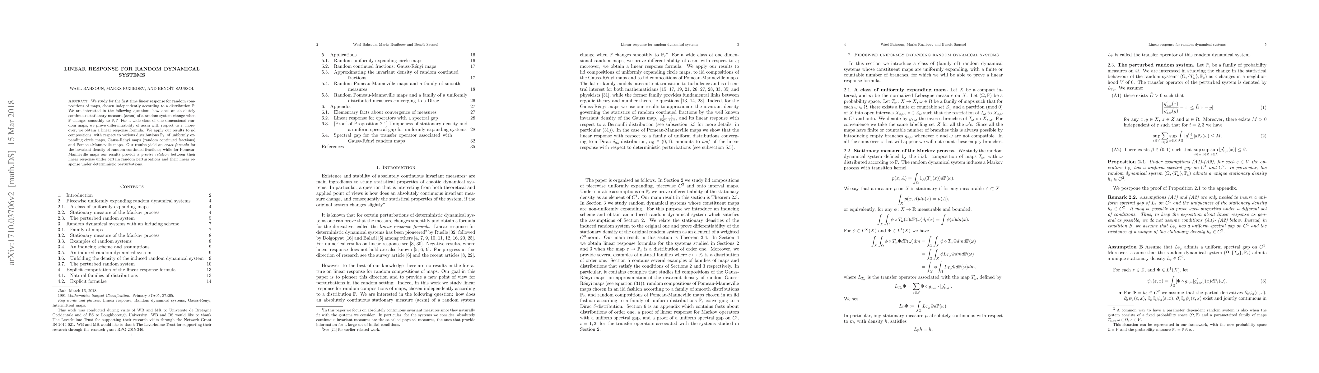 This paper investigates the linear response of random dynamical systems to smooth changes in their underlying probability distributions. The authors prove the differentiability of the absolutely continuous stationary measure with respect to these perturbations and derive a linear response formula applicable to various random map compositions.