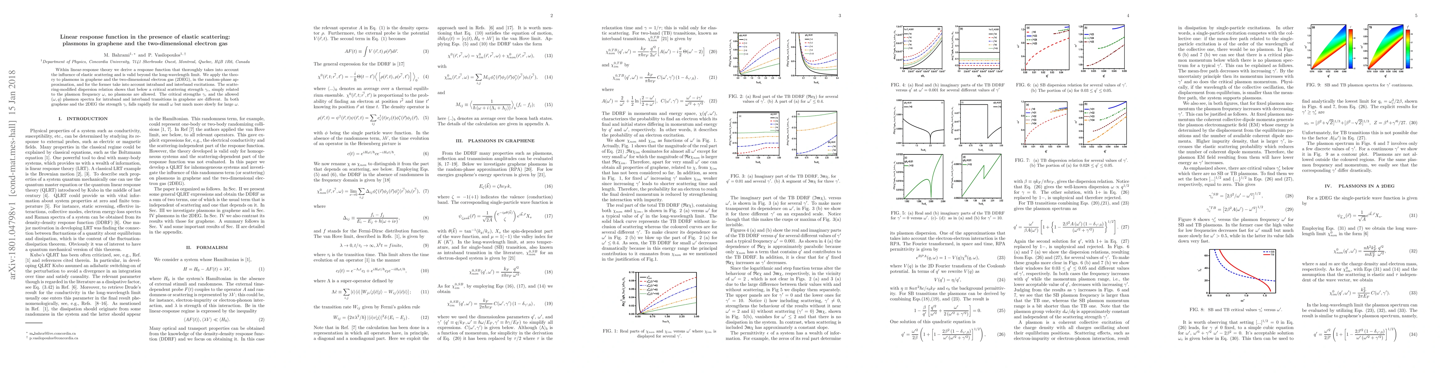 Within linear-response theory we derive a response function that thoroughly takes into account the influence of elastic scattering and is valid beyond the long-wavelength limit. We apply the theo-ry to plasmons in graphene and the two-dimensional electron gas (2DEG), in the random-phase ap-proximation, and for the former take into account intraband and interband excitations. The scatte-ring-modified dispersion relation shows that below a critical scattering strength $\gamma_c$, simply related to the plasmon frequency $\omega$, no plasmons are allowed. The critical strengths $\gamma_c$ and the allowed $(\omega, q)$ plasmon spectra for intraband and interband transitions in graphene are different. In both graphene and the 2DEG the strength $\gamma_c$ falls rapidly for small $\omega$ but much more slowly for large $\omega$.