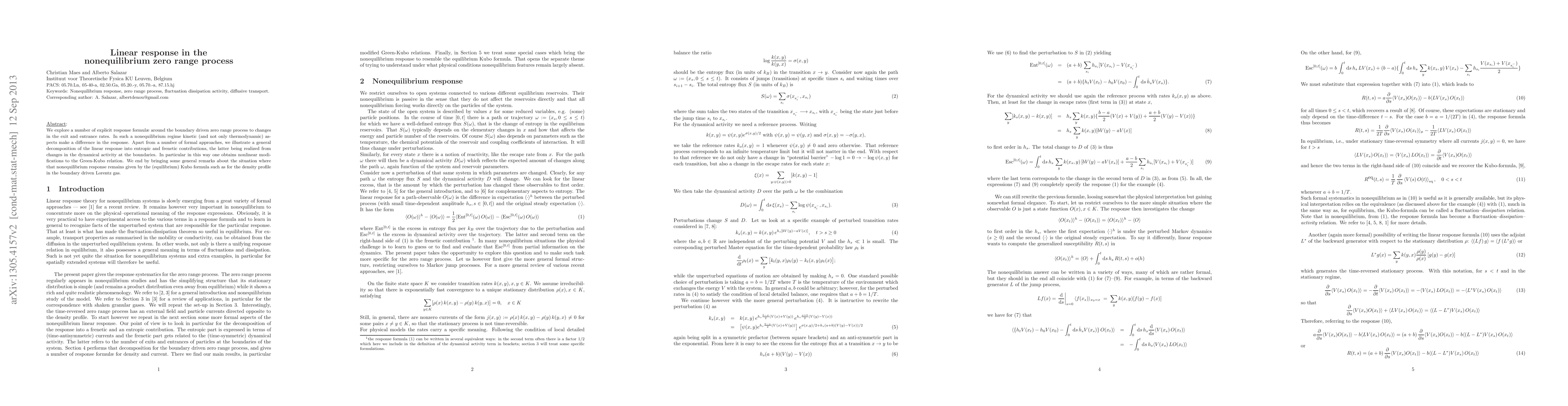 We explore a number of explicit response formulae around the boundary driven zero range process to changes in the exit and entrance rates. In such a nonequilibrium regime kinetic (and not only thermodynamic) aspects make a difference in the response. Apart from a number of formal approaches, we illustrate a general decomposition of the linear response into entropic and frenetic contributions, the latter being realized from changes in the dynamical activity at the boundaries. In particular, in this way one obtains nonlinear modifications to the Green-Kubo relation. We end by bringing some general remarks about the situation where that nonequilibrium response remains given by the (equilibrium) Kubo formula such as for the density profile in the boundary driven Lorentz gas.