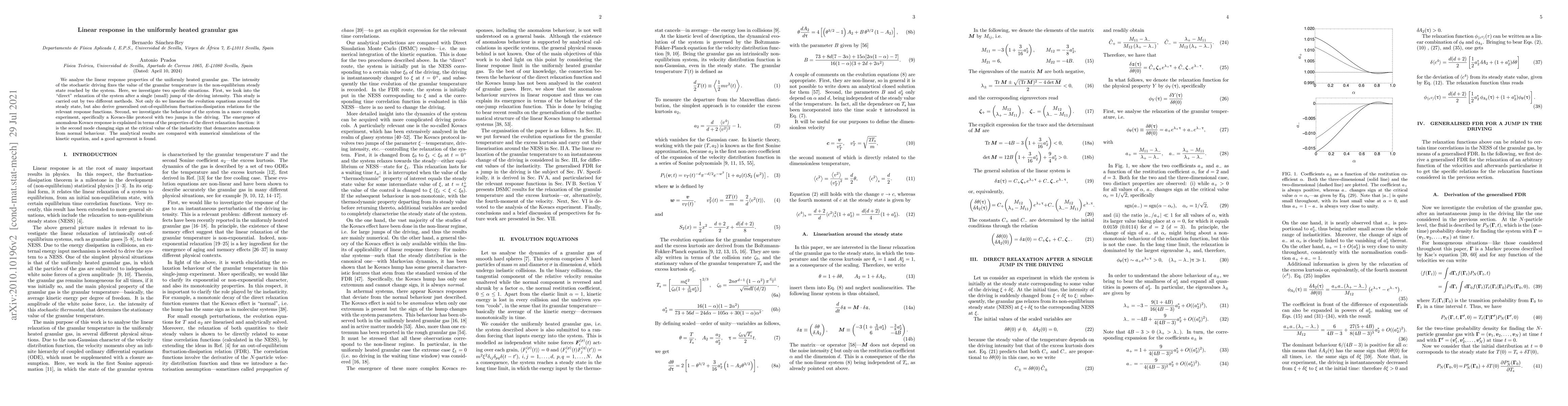 This paper investigates linear response properties in uniformly heated granular gas, focusing on the relaxation dynamics following changes in heating intensity. It identifies anomalous Kovacs response through the sign change of the second mode in the direct relaxation function, validated by numerical simulations.