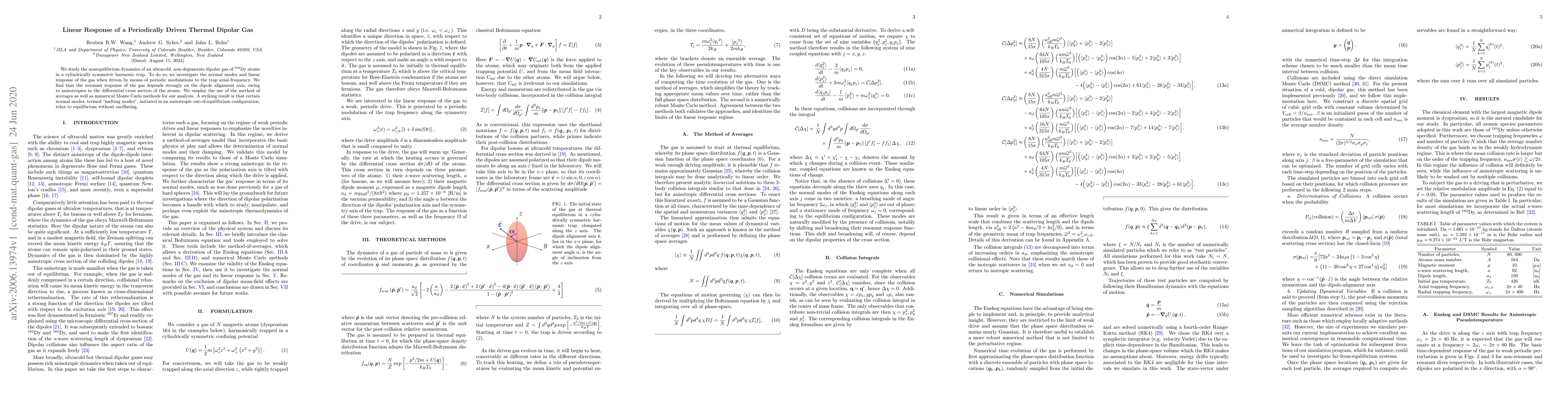 We study the nonequilibrium dynamics of an ultracold, non-degenerate dipolar gas of $^{164}$Dy atoms in a cylindrically symmetric harmonic trap. To do so, we investigate the normal modes and linear response of the gas when driven by means of periodic modulations to the trap axial-frequency. We find that the resonant response of the gas depends strongly on the dipole alignment axis, owing to anisotropies in the differential cross section of the atoms. We employ the use of the method of averages as well as numerical Monte Carlo methods for our analysis. A striking result is that certain normal modes, termed "melting modes", initiated in an anisotropic out-of-equilibrium configuration, relax to equilibrium without oscillating.