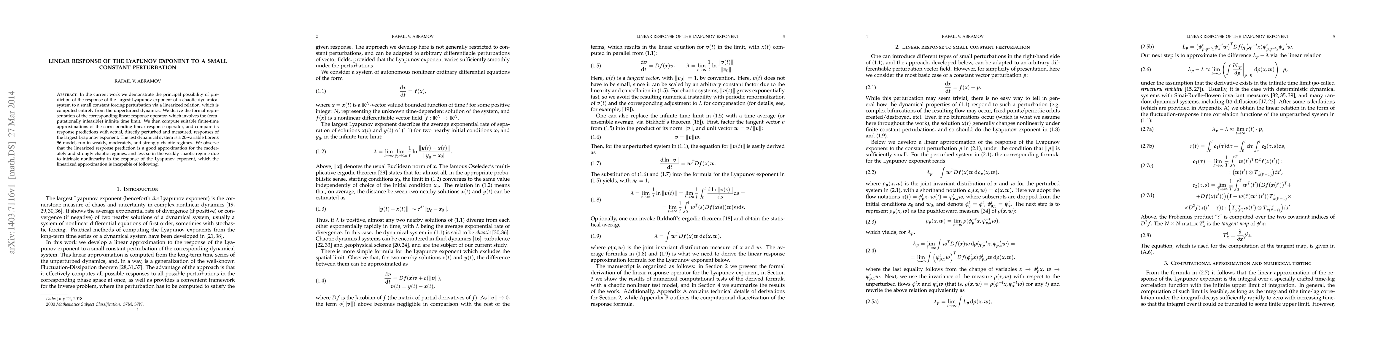 This paper demonstrates a linear response prediction for the largest Lyapunov exponent of chaotic systems under small constant perturbations, using a linearized relation derived from unperturbed dynamics. The method is tested on a 20-variable Lorenz 96 model, showing good approximation in moderately and strongly chaotic regimes but less accuracy in weakly chaotic regimes due to inherent nonlinearity.