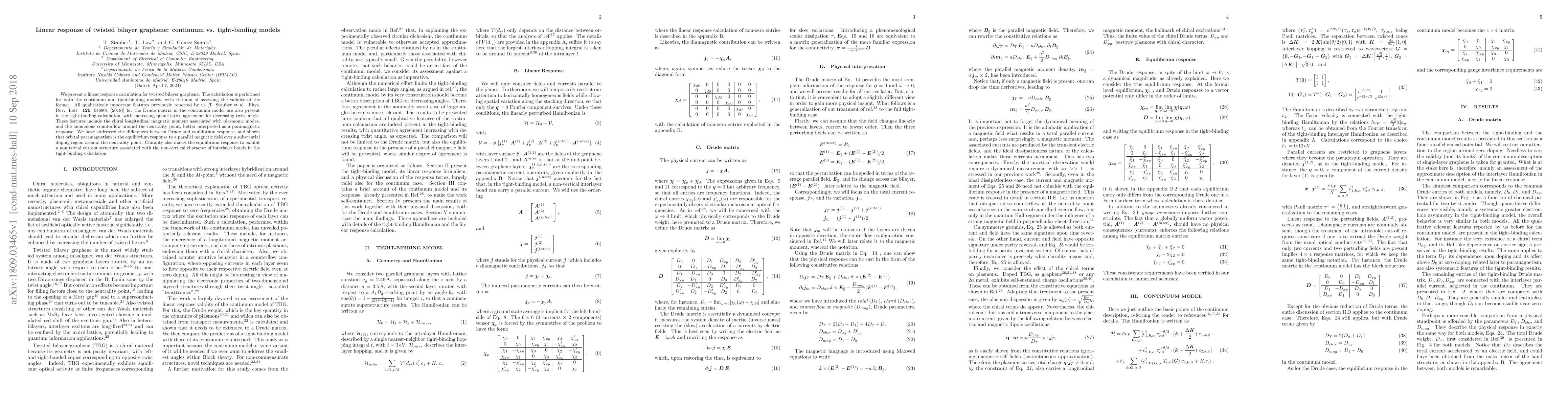 This research compares the linear response of twisted bilayer graphene using continuum and tight-binding models, finding that both models exhibit similar qualitative features, particularly for plasmonic modes and anomalous counterflow, with agreement improving at smaller twist angles. Orbital paramagnetism is identified as the equilibrium response to a parallel magnetic field.