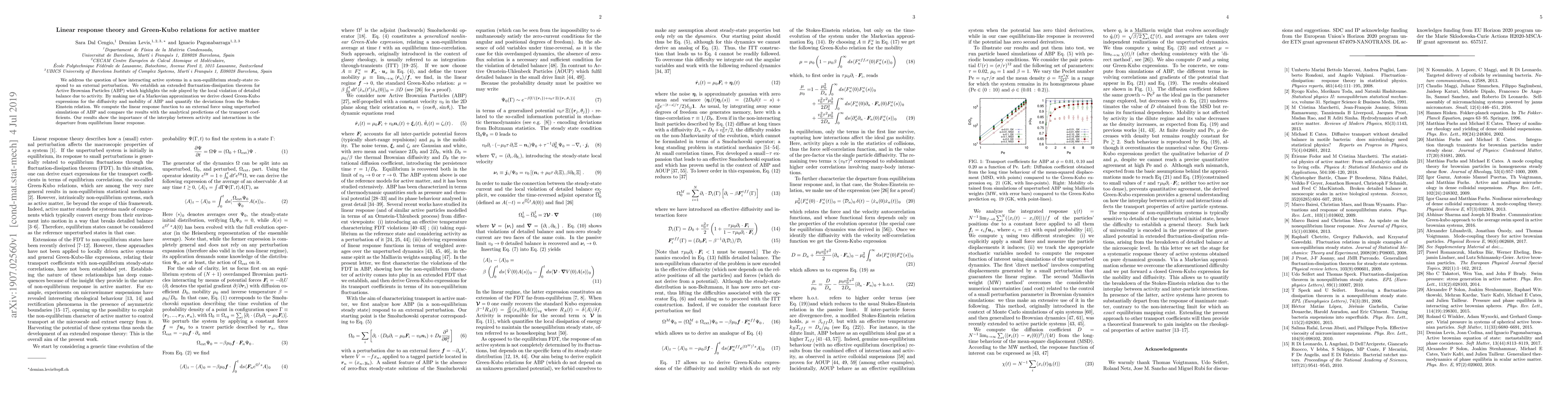 We address the question of how interacting active systems in a non-equilibrium steady-state respond to an external perturbation. We establish an extended fluctuation-dissipation theorem for Active Brownian Particles (ABP) which highlights the role played by the local violation of detailed balance due to activity. By making use of a Markovian approximation we derive closed Green-Kubo expressions for the diffusivity and mobility of ABP and quantify the deviations from the Stokes-Einstein relation. We compute the linear response function to an external force using unperturbed simulations of ABP and compare the results with the analytical predictions of the transport coefficients. Our results show the importance of the interplay between activity and interactions in the departure from equilibrium linear response.