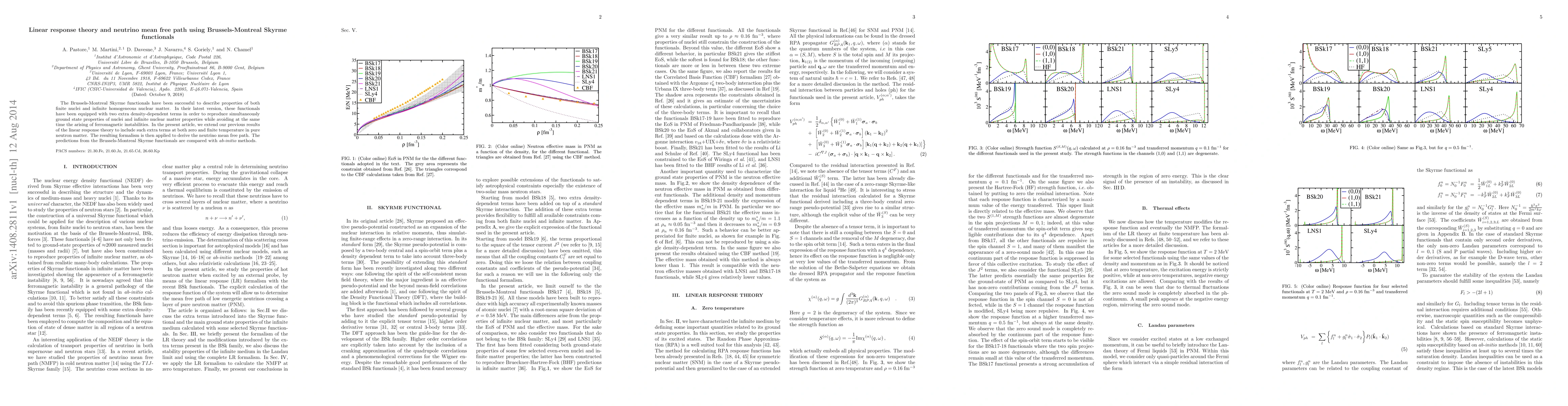 This paper extends linear response theory to include new density-dependent terms in Brussels-Montreal Skyrme functionals, applied to pure neutron matter at zero and finite temperatures. The derived formalism is used to calculate the neutrino mean free path, with results compared to ab-initio methods.