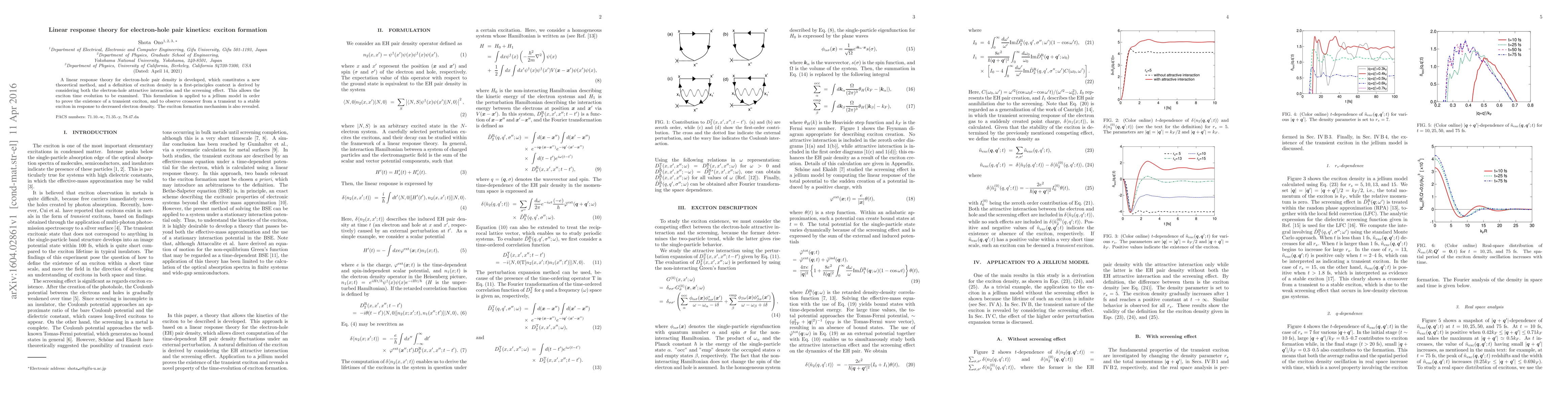 This paper develops a linear response theory for electron-hole pair kinetics, defining exciton density in a first-principles context and examining exciton time evolution. The theory is applied to a jellium model, revealing transient and stable exciton formation mechanisms.