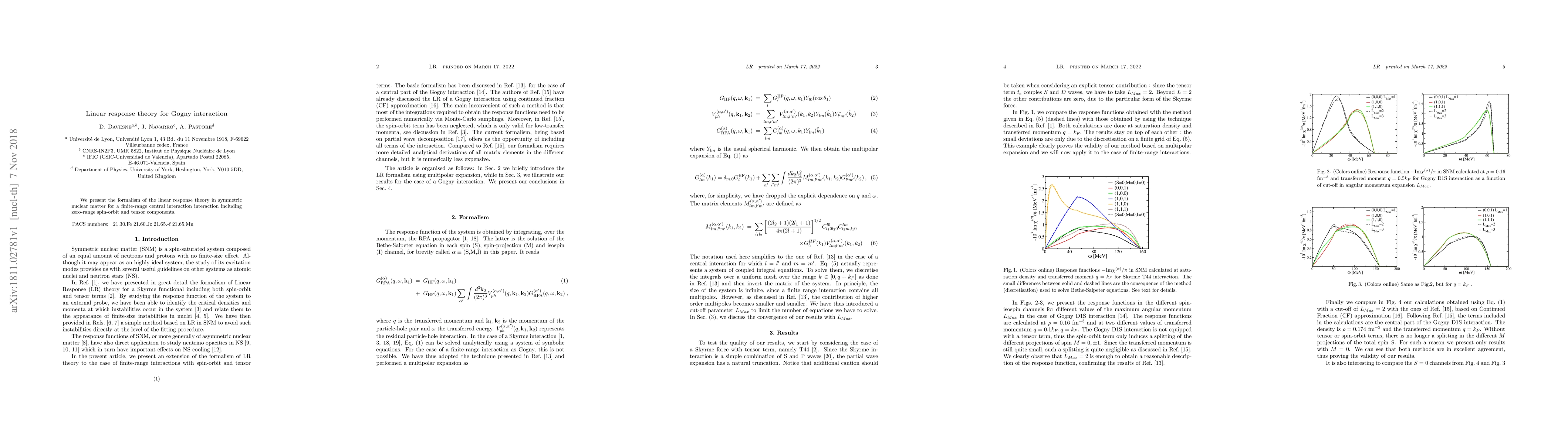 Researchers developed a linear response theory for nuclear matter, incorporating finite-range interactions with spin-orbit and tensor components, to better understand atomic nuclei.