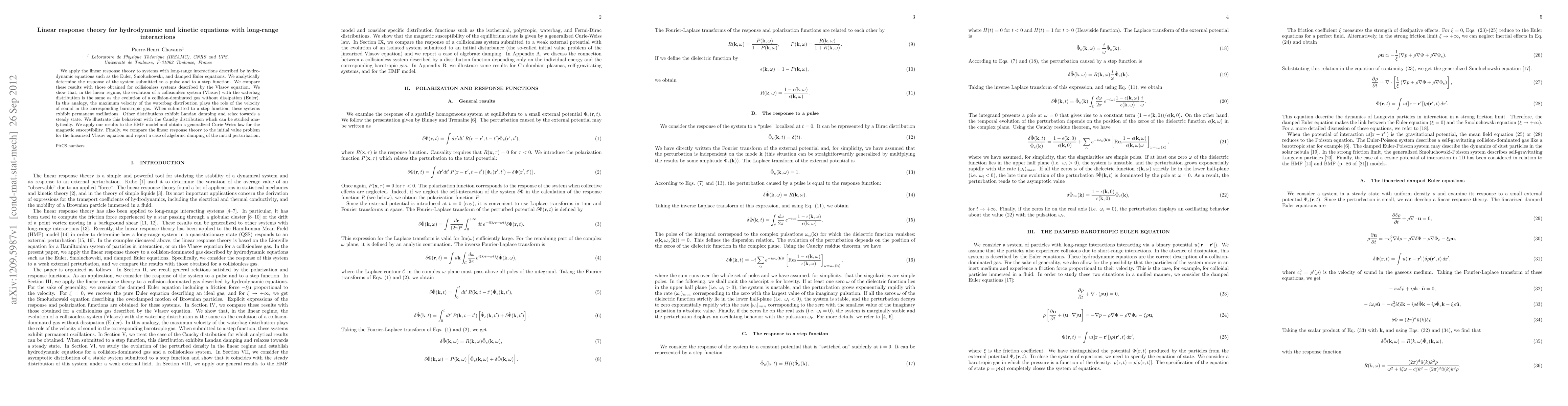 The paper applies linear response theory to study systems with long-range interactions, comparing results with collisionless systems described by the Vlasov equation, and illustrating behavior using the Cauchy distribution.