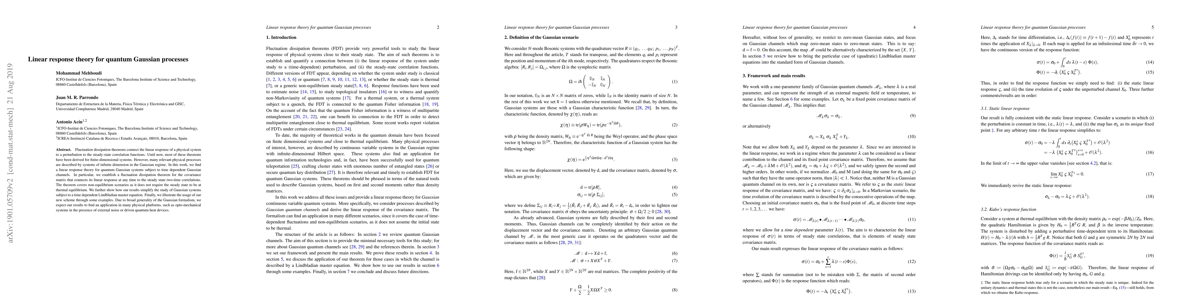This paper introduces a linear response theory for quantum Gaussian processes under time-dependent Gaussian channels, providing a fluctuation dissipation theorem that connects the system's response to its steady-state correlations. The findings have broad implications for understanding non-equilibrium phenomena in various physical platforms, such as opto-mechanical systems and driven quantum heat devices.