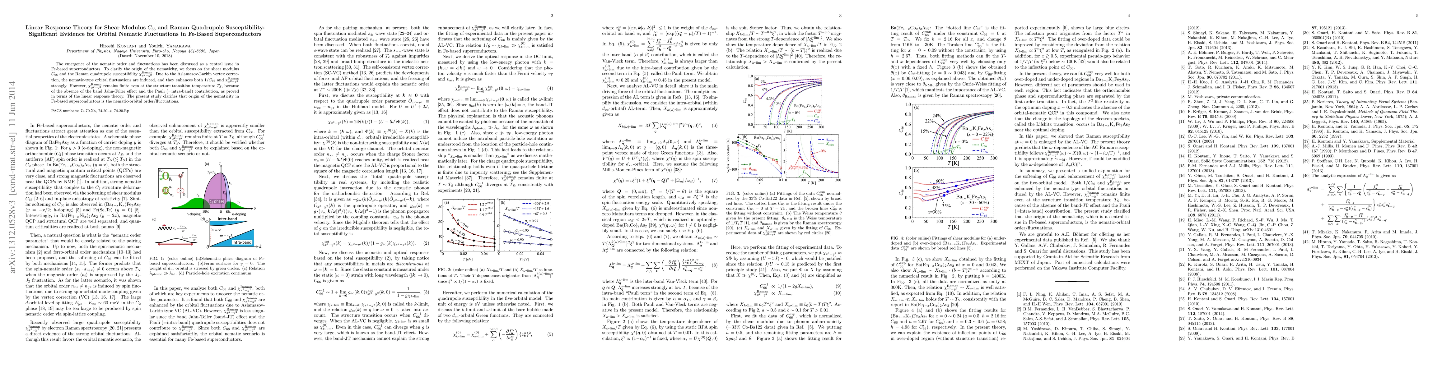 This paper investigates the origin of nematicity in Fe-based superconductors using linear response theory, focusing on shear modulus $C_{66}$ and Raman quadrupole susceptibility $\chi_{x^2-y^2}^{Raman}$. It finds significant evidence for nematic-orbital fluctuations as the source of nematicity, with $\chi_{x^2-y^2}^{Raman}$ remaining finite at the transition temperature due to the absence of the band Jahn-Teller effect and Pauli contribution.