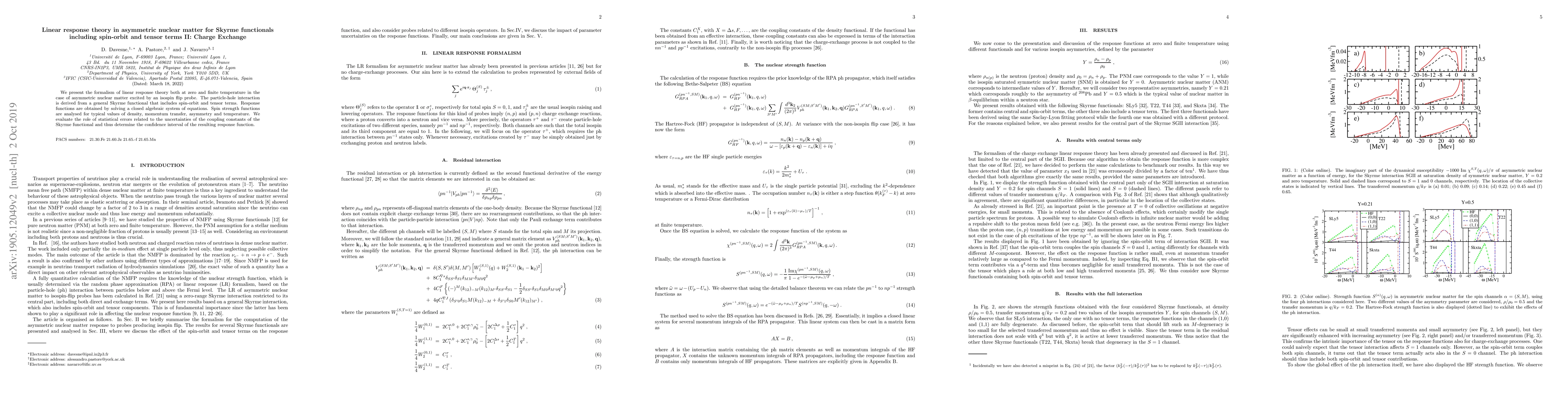 This paper develops the formalism of linear response theory for asymmetric nuclear matter using Skyrme functionals with spin-orbit and tensor terms, focusing on charge exchange processes. It provides response functions derived from a closed algebraic system and analyzes spin strength functions under various conditions.