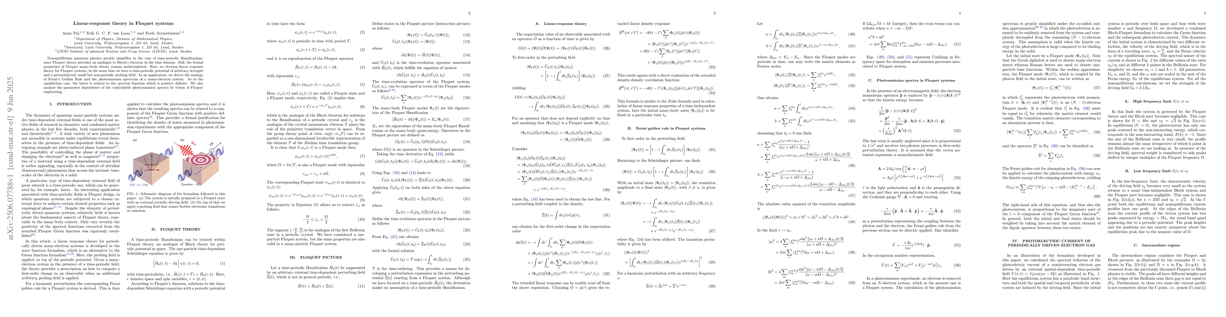 This research develops a linear response theory for Floquet systems, akin to Bloch's theorem in the time domain, enabling simplification of nonequilibrium quantum physics with time-periodic Hamiltonians. It derives a Fermi's Golden Rule analogue and analyzes photoemission spectra, demonstrating their positive definiteness and controllability via Floquet engineering.