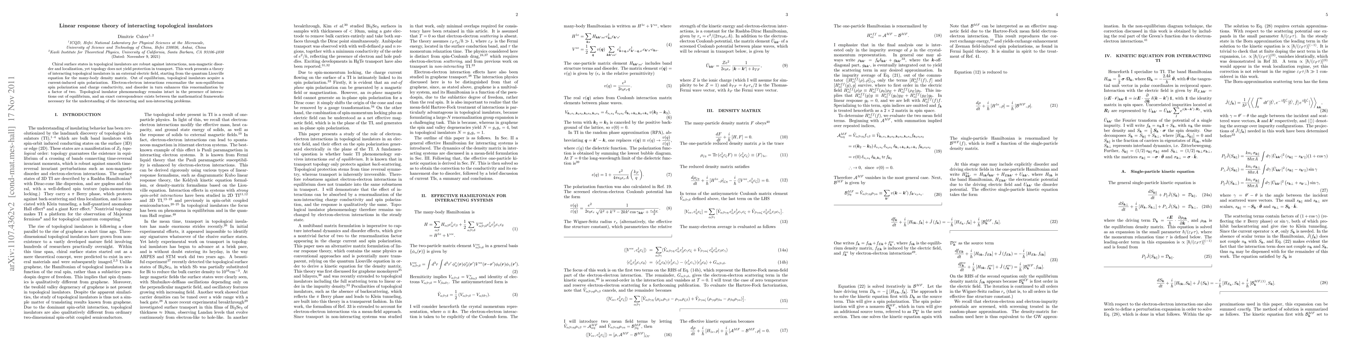 Chiral surface states in topological insulators are robust against interactions, non-magnetic disorder and localization, yet topology does not yield protection in transport. This work presents a theory of interacting topological insulators in an external electric field, starting from the quantum Liouville equation for the many-body density matrix. Out of equilibrium, topological insulators acquire a current-induced spin polarization. Electron-electron interactions renormalize the non-equilibrium spin polarization and charge conductivity, and disorder in turn enhances this renormalization by a factor of two. Topological insulator phenomenology remains intact in the presence of interactions out of equilibrium, and an exact correspondence exists between the mathematical frameworks necessary for the understanding of the interacting and non-interacting problems.