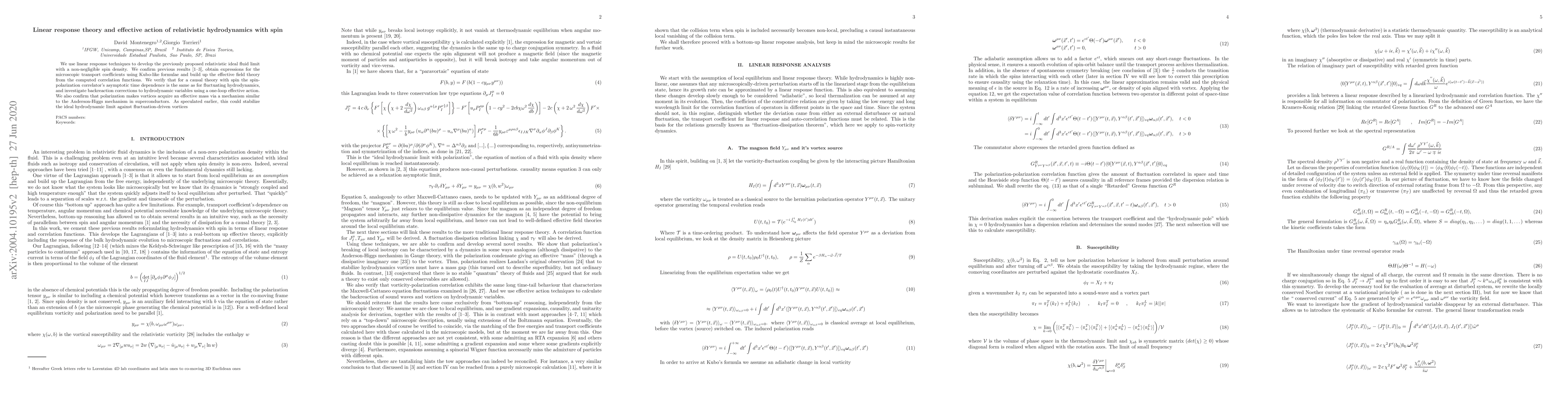 We use linear response techniques to develop the previously proposed relativistic ideal fluid limit with a non-negligible spin density. We confirm previous results and obtain expressions for the microscopic transport coefficients using Kubo-like formulae and buld up the effective field theory from the computed correlation functions. We also confirm that polarization makes vortices aquire an effective mass via a mechanism similar to the Anderson-Higgs mechanism in superconductors. As speculated earlier, this could stabilize the ideal hydrodynamic limit against fluctuation-driven vortices