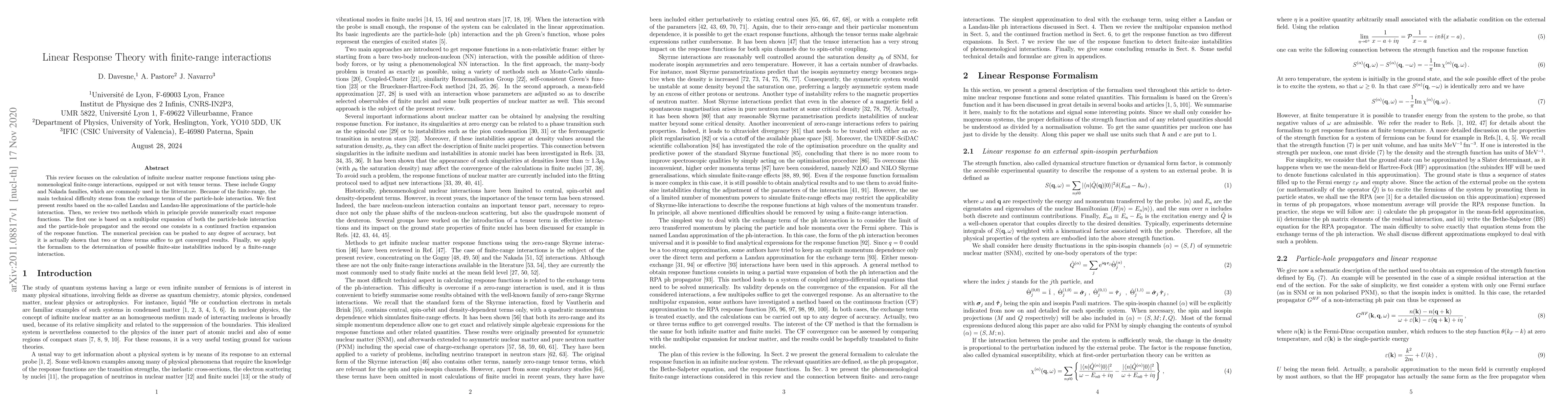 This paper reviews the calculation of nuclear matter response functions using finite-range interactions, focusing on methods to handle exchange terms and applying these techniques to detect finite-size instabilities. It explores Landau approximations and numerically exact methods like multipolar and continued fraction expansions.