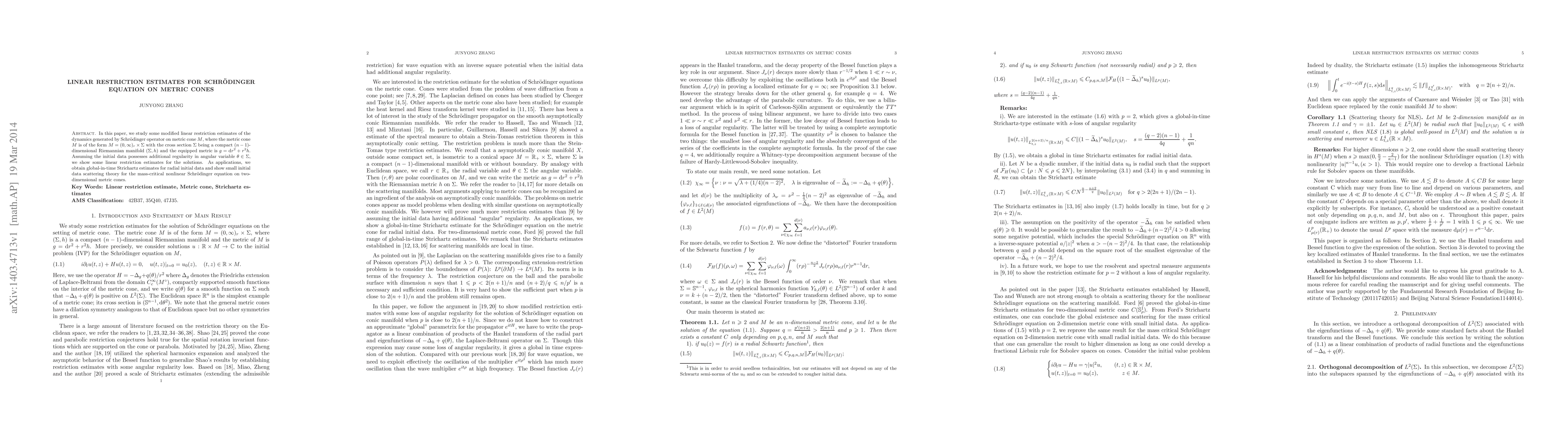 This paper investigates modified linear restriction estimates for the Schrödinger equation on metric cones, specifically focusing on cones formed by $(0,\infty)_r \times \Sigma$ with $\Sigma$ a compact $(n-1)$-dimensional Riemannian manifold. It demonstrates global Strichartz estimates for radial initial data and proves small data scattering for the mass-critical nonlinear Schrödinger equation on two-dimensional metric cones.