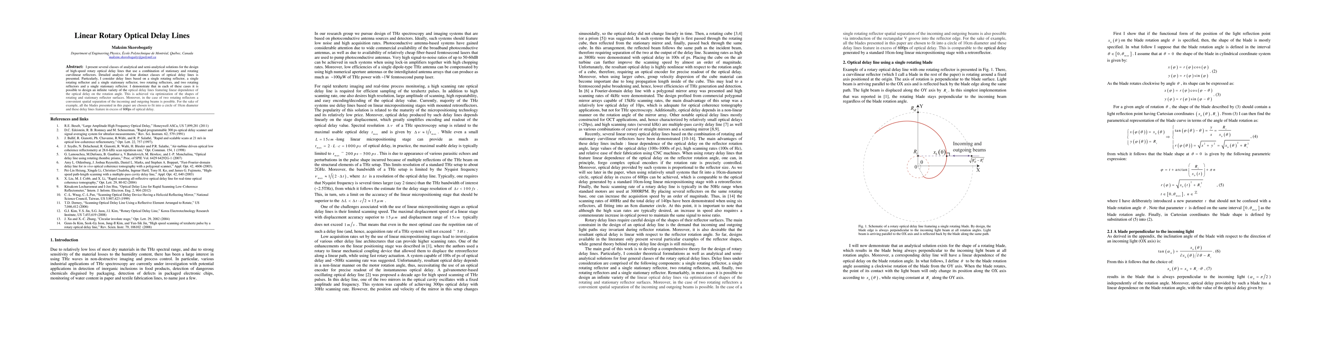 I present several classes of analytical and semi-analytical solutions for the design of high-speed rotary optical delay lines that use a combination of stationary and rotating curvilinear reflectors. Detailed analysis of four distinct classes of optical delay lines is presented. Particularly, I consider delay lines based on a single rotating reflector, a single rotating reflector and a single stationary reflector, two rotating reflectors, and two rotating reflectors and a single stationary reflector. I demonstrate that in each of these cases it is possible to design an infinite variety of the optical delay lines featuring linear dependence of the optical delay on the rotation angle. This is achieved via optimization of the shapes of rotating and stationary reflector surfaces. Moreover, in the case of two rotating reflectors a convenient spatial separation of the incoming and outgoing beams is possible. For the sake of example, all the blades presented in this paper are chosen to fit into a circle of 10cm diameter and these delay lines feature in excess of 600ps of optical delay.