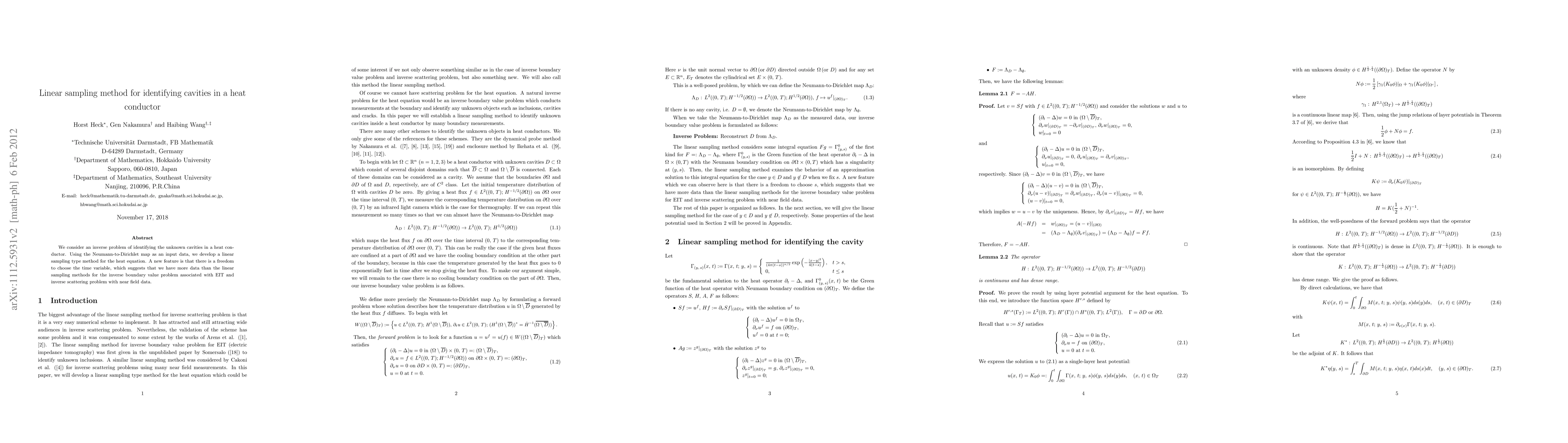 Summary: This research develops a linear sampling method for identifying unknown cavities in a heat conductor using the Neumann-to-Dirichlet map, allowing flexibility in choosing the time variable, which provides more data compared to similar methods used in electrical impedance tomography and inverse scattering.
