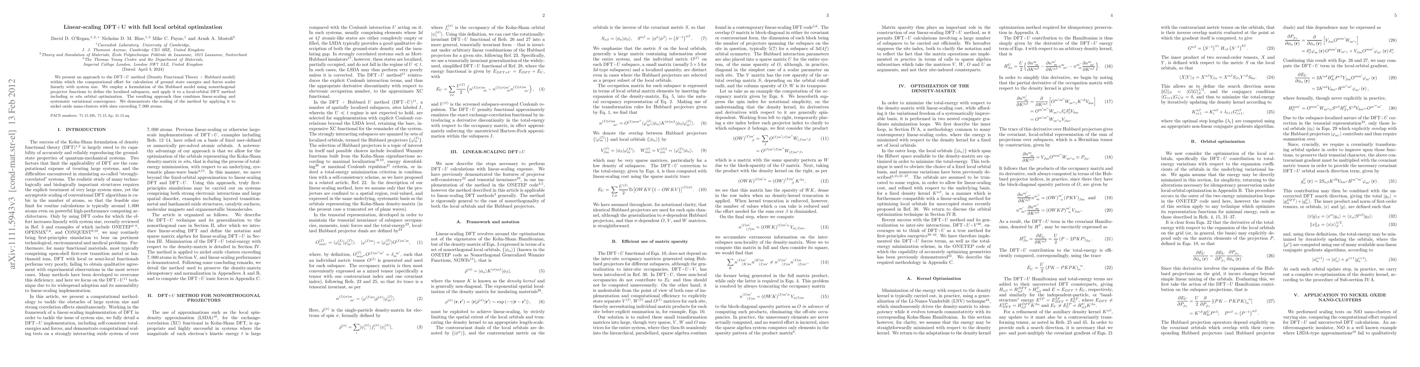 This paper introduces a linear-scaling DFT+U method that combines the computational efficiency of linear scaling with the accuracy of full local orbital optimization, demonstrating its effectiveness on nickel oxide nano-clusters with over 7,000 atoms. The approach uses nonorthogonal projector functions for the Hubbard model and achieves systematic variational convergence.