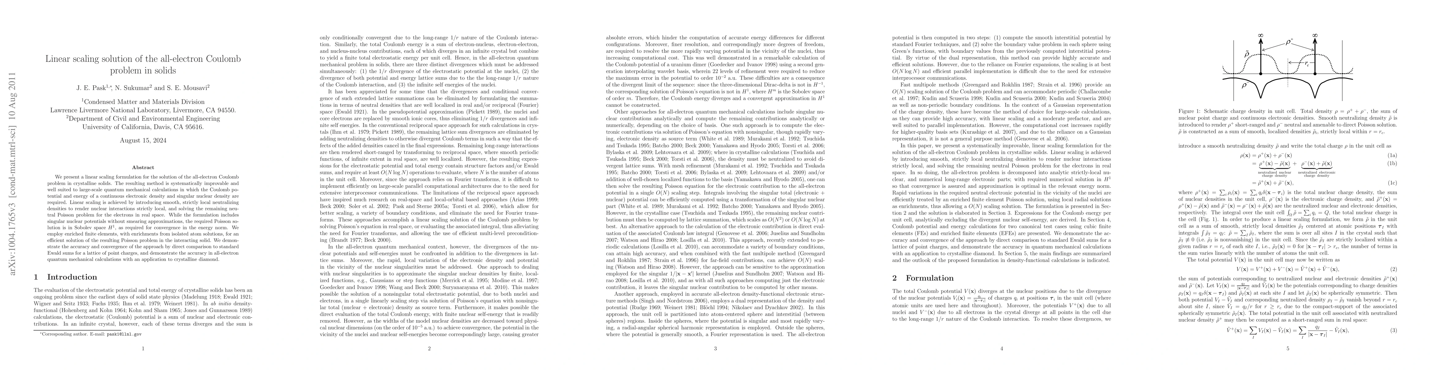This paper presents a linear scaling method for solving the all-electron Coulomb problem in crystalline solids, utilizing smooth, local neutralizing densities to achieve linear scaling. The method employs enriched finite elements for efficient computation and demonstrates accuracy through comparisons with standard Ewald sums and applications to crystalline diamond.