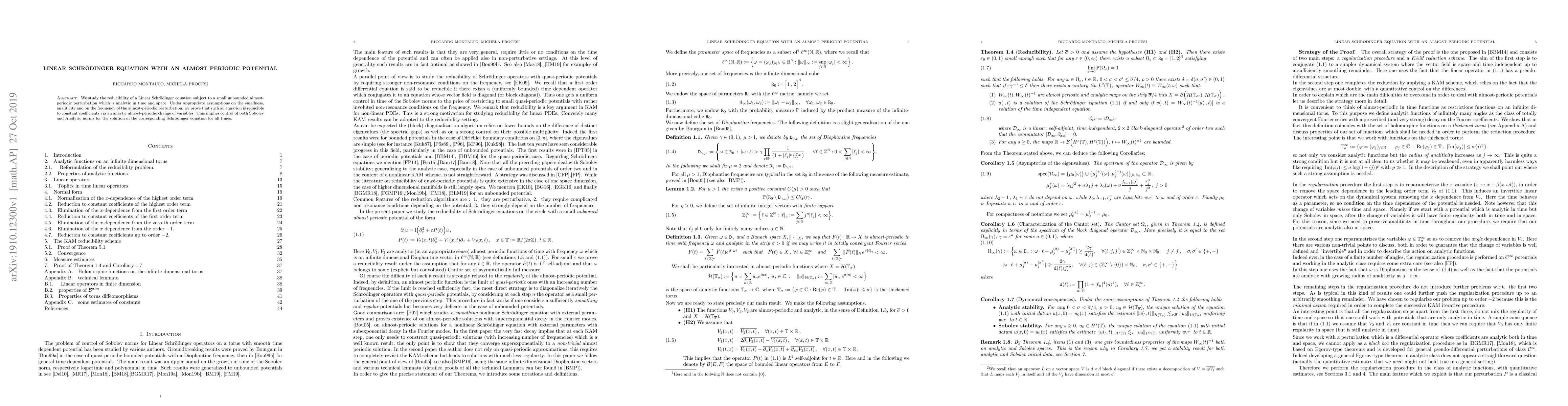 This paper investigates the reducibility of a Linear Schrödinger equation with a small, unbounded almost-periodic perturbation. It proves that under specific conditions, the equation can be transformed into one with constant coefficients through an analytic almost-periodic change of variables, ensuring control over Sobolev and Analytic norms for the solution at all times.