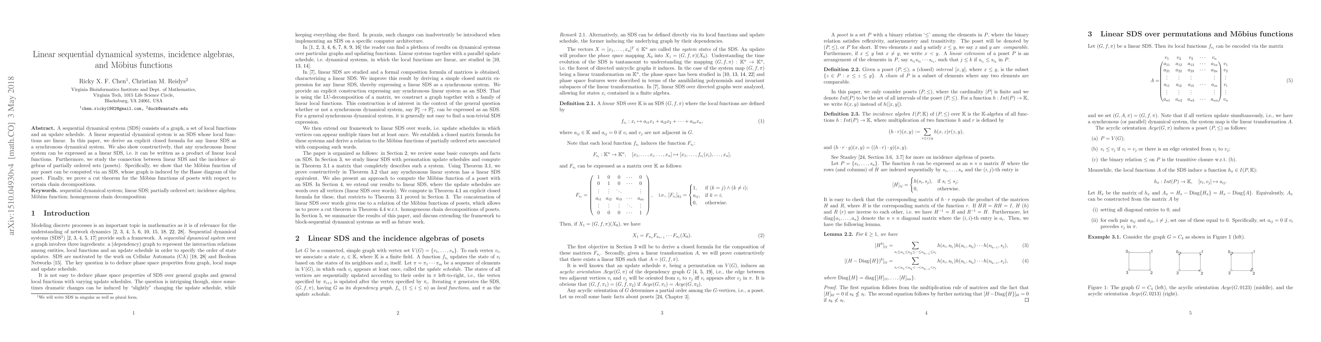 This paper derives a closed formula for linear sequential dynamical systems (SDS) as synchronous dynamical systems and shows their equivalence to synchronous linear systems. It also explores the relationship between linear SDS and incidence algebras of posets, demonstrating the computation of Möbius functions via SDS and proving a cut theorem for these functions.