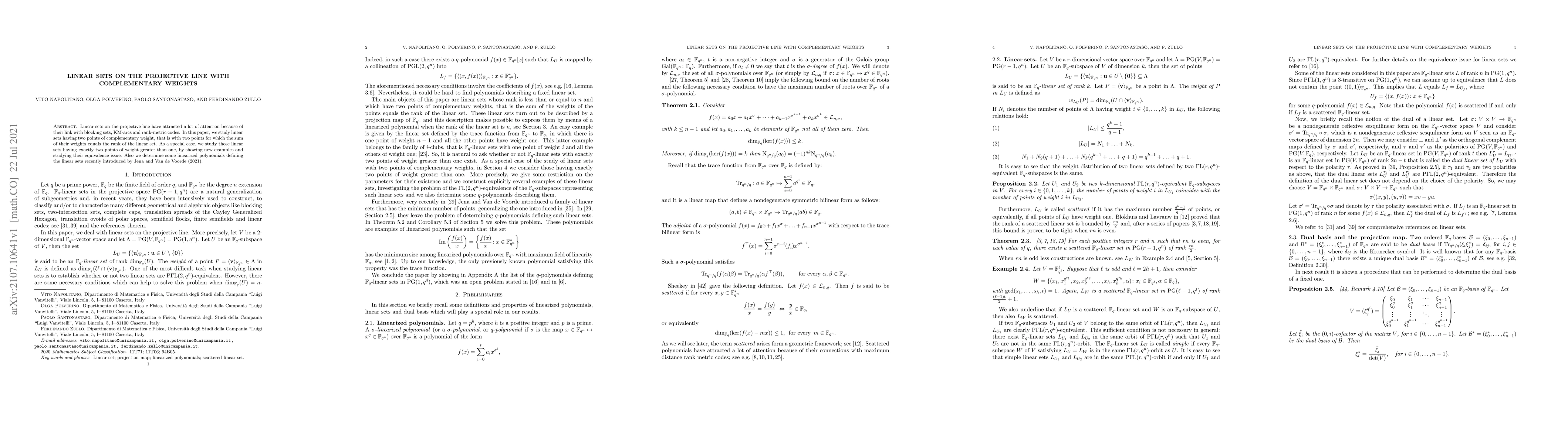 This paper investigates linear sets on the projective line with two points of complementary weight, exploring their connections to blocking sets, KM-arcs, and rank-metric codes. It presents new examples and examines the equivalence of linear sets with exactly two points of weight greater than one, and determines some linearized polynomials defining recent linear sets by Jena and Van de Voorde (2021).