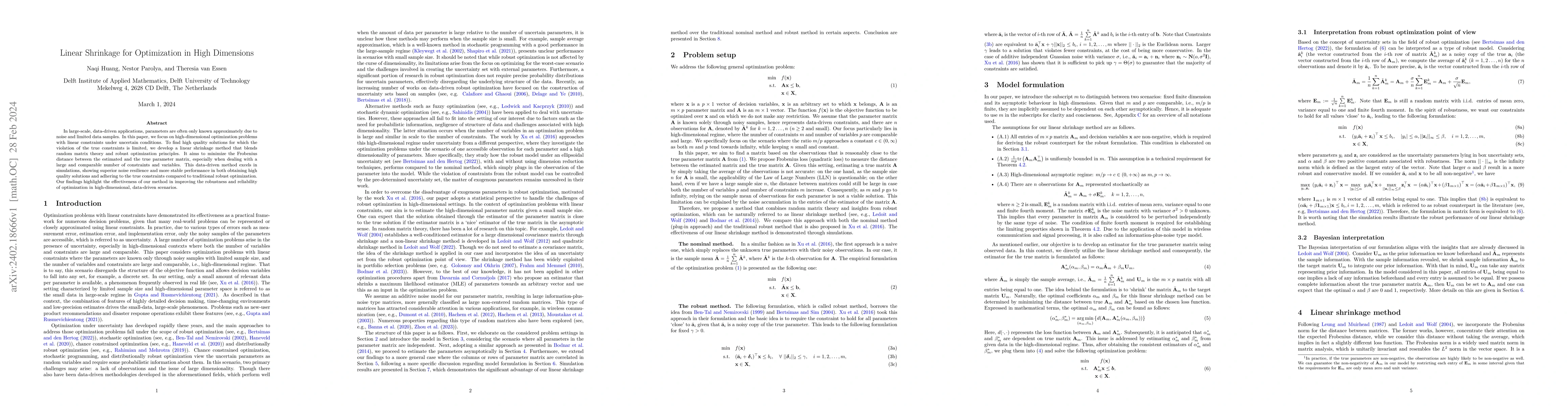 This paper introduces a linear shrinkage method combining random matrix theory and robust optimization to tackle high-dimensional optimization problems under uncertainty. The method minimizes the Frobenius distance between estimated and true parameter matrices, demonstrating superior noise resilience and stable performance compared to traditional robust optimization.
