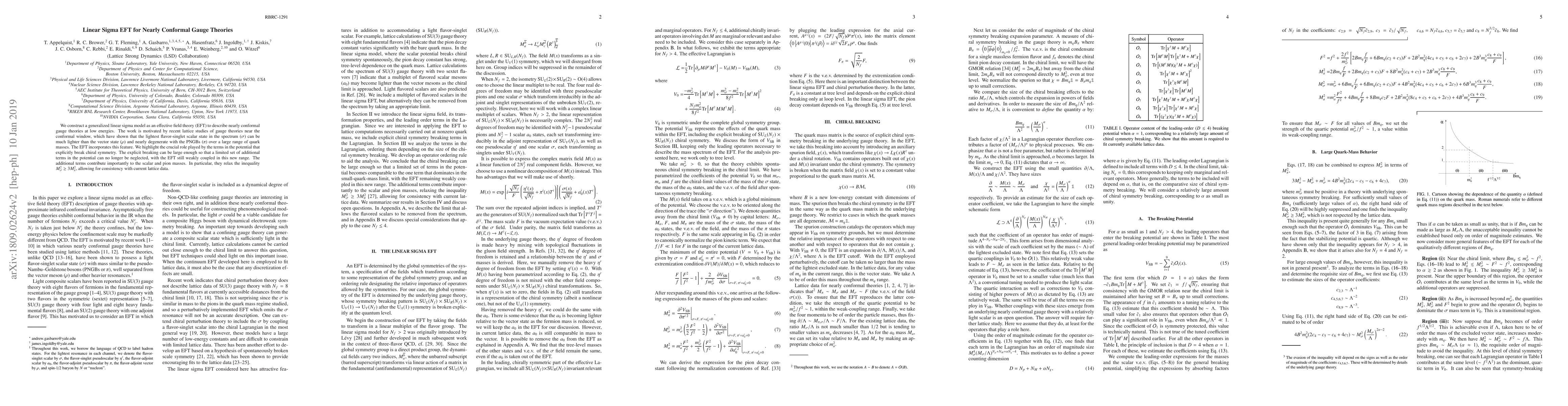 This paper develops a generalized linear sigma effective field theory to describe nearly conformal gauge theories, focusing on the low-energy behavior of light scalar and pion states. The model highlights the role of chiral symmetry breaking terms in accurately matching lattice data.