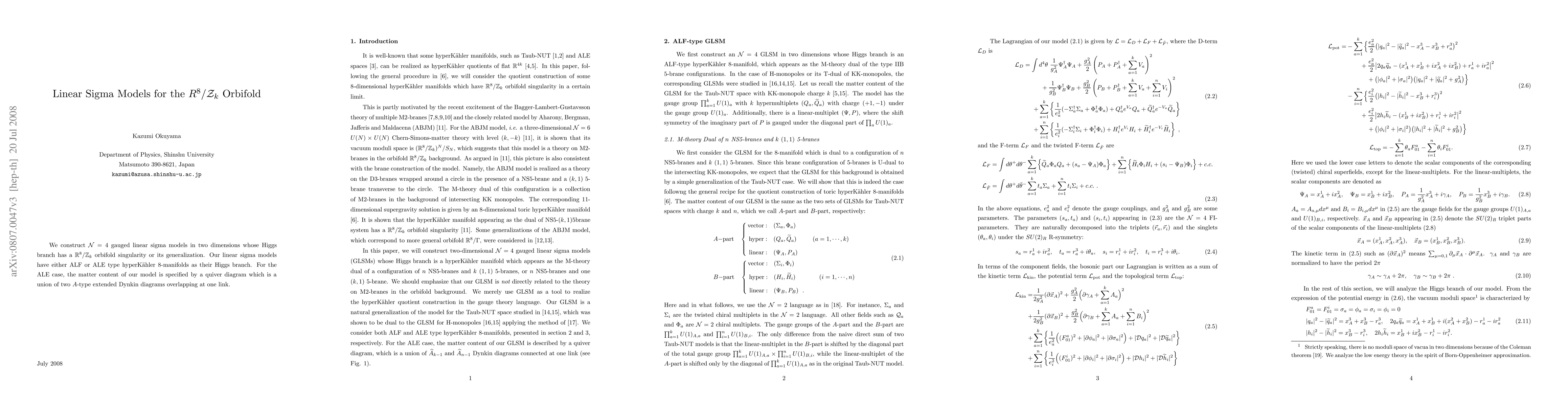 Summary: This paper constructs N=4 gauged linear sigma models in two dimensions with R^8/Z_k orbifold singularities, featuring either ALF or ALE type hyperKähler 8-manifolds as their Higgs branches, with the ALE case defined by a specific quiver diagram.