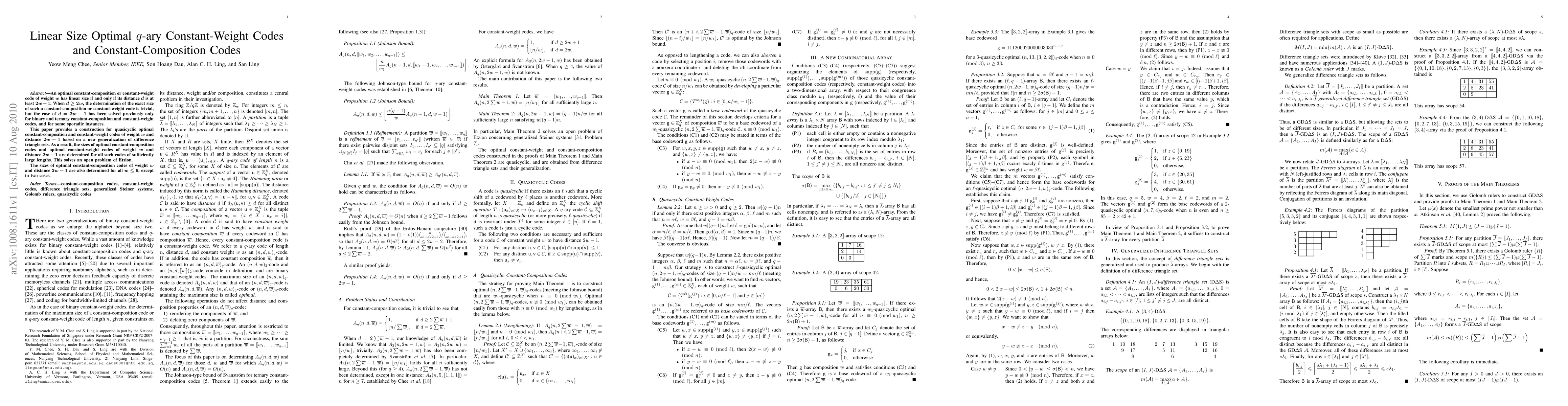 An optimal constant-composition or constant-weight code of weight $w$ has linear size if and only if its distance $d$ is at least $2w-1$. When $d\geq 2w$, the determination of the exact size of such a constant-composition or constant-weight code is trivial, but the case of $d=2w-1$ has been solved previously only for binary and ternary constant-composition and constant-weight codes, and for some sporadic instances. This paper provides a construction for quasicyclic optimal constant-composition and constant-weight codes of weight $w$ and distance $2w-1$ based on a new generalization of difference triangle sets. As a result, the sizes of optimal constant-composition codes and optimal constant-weight codes of weight $w$ and distance $2w-1$ are determined for all such codes of sufficiently large lengths. This solves an open problem of Etzion. The sizes of optimal constant-composition codes of weight $w$ and distance $2w-1$ are also determined for all $w\leq 6$, except in two cases.
